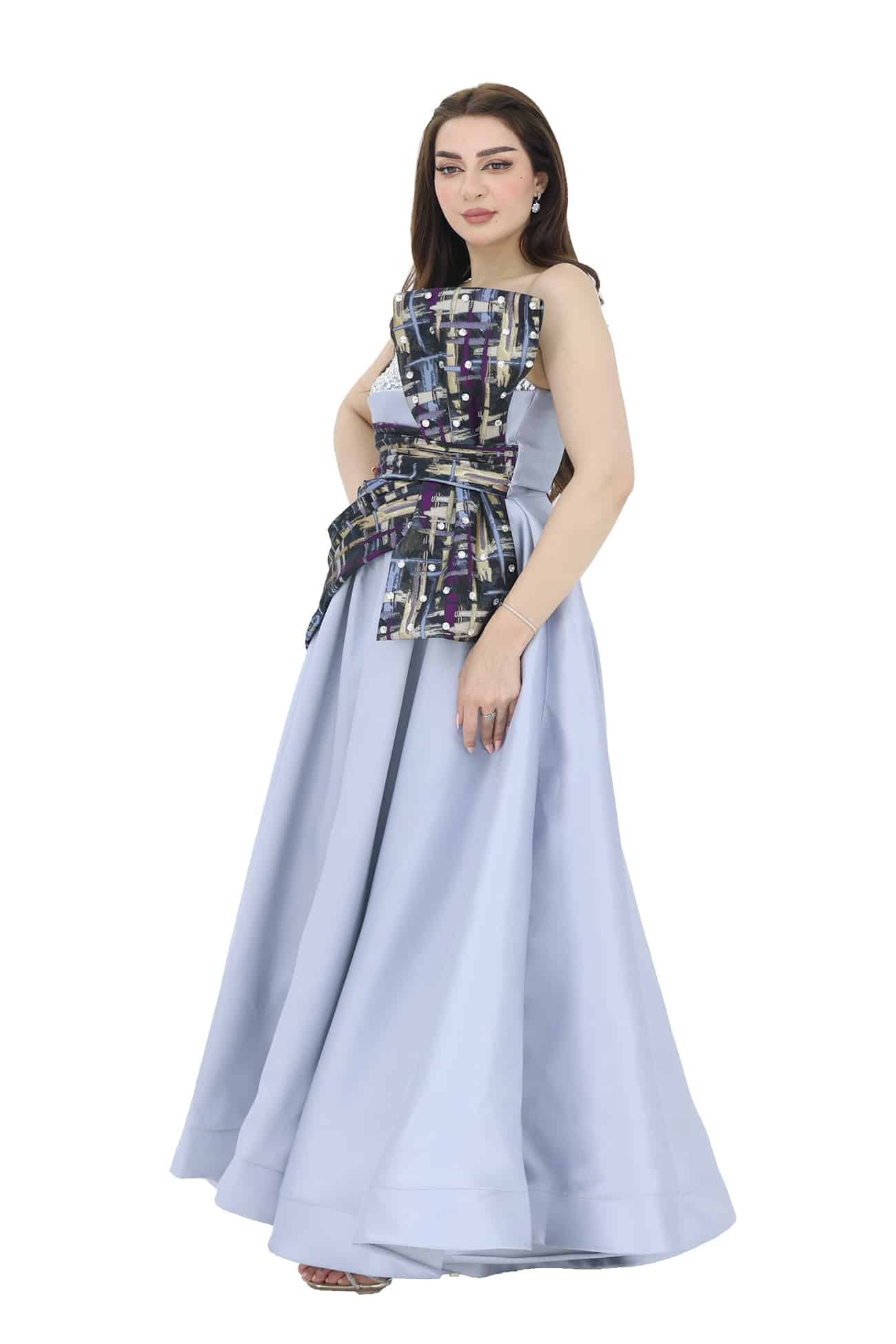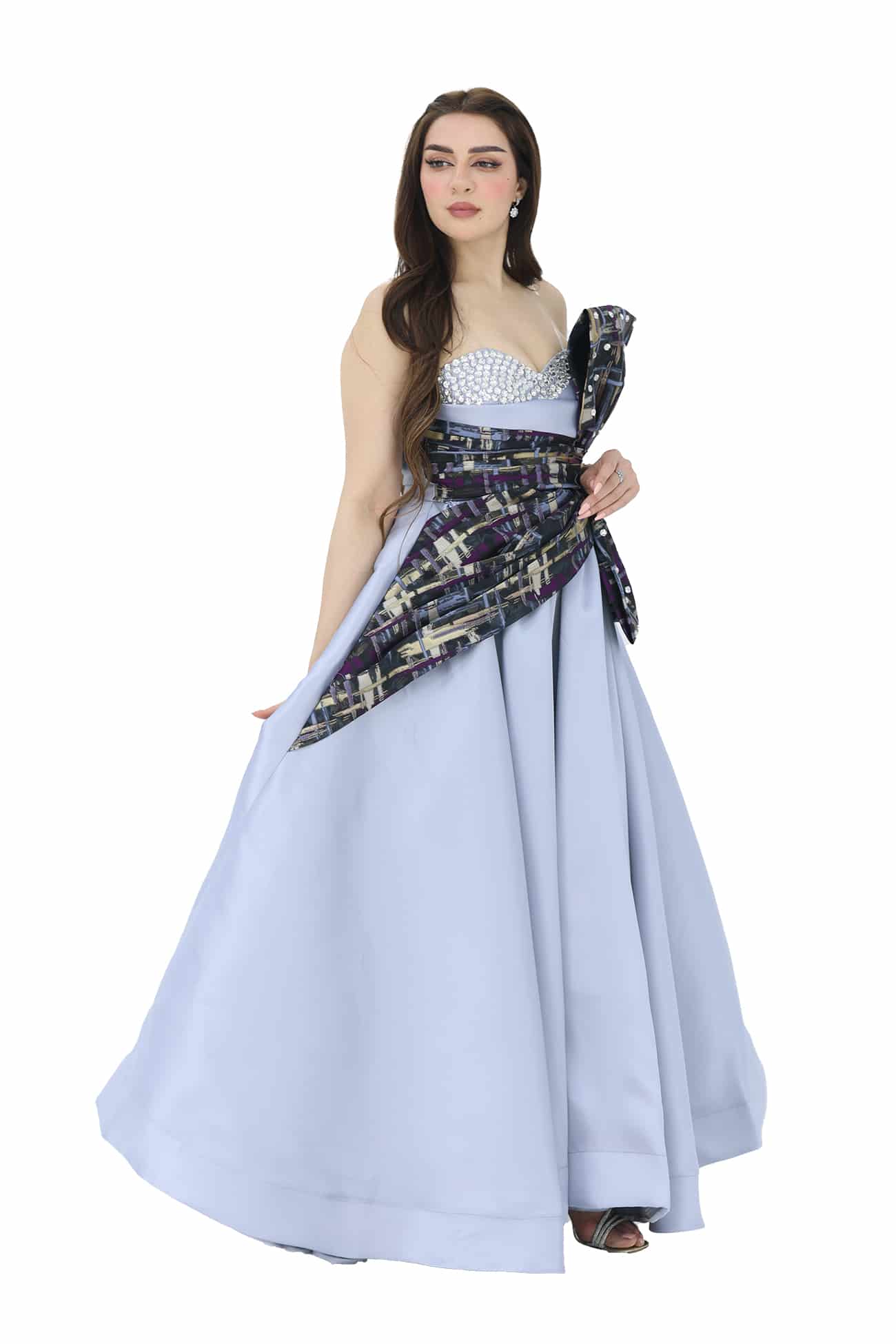 فستان سهرة بفيونكة مميزة على الصدر من خامة الميكادو بتطريز انيق تندمج الألوان في الفونكة والصدر مما يجعل التصميم جميل يتميز الفستان بقصة سهرة أنيقة وجذابة، حيث يتم تصميمه بفيونكة مميزة توضع على الصدر، مما يضفي لمسة رومانسية وجمالية على التصميم. الفيونكة تكون متوسطة الحجم لتبرز بشكل بارز، أو تكون أنثوية ورقيقة لتضفي لمسة ساحرة. يتمتع بتصميم جميل ومتألق. يعد الفستان خيارًا رائعًا للسهرات والمناسبات الخاصة، ويكمل إطلالة من يرتديه بأناقة وجاذبية.