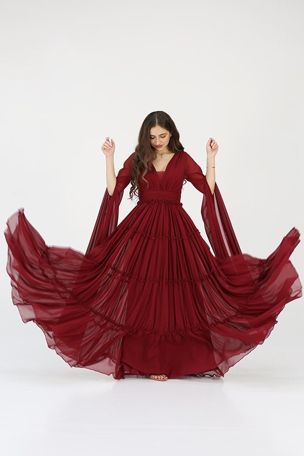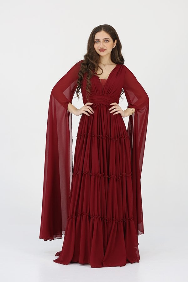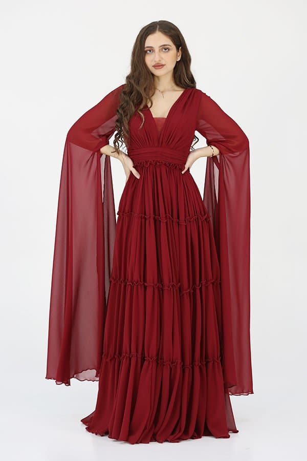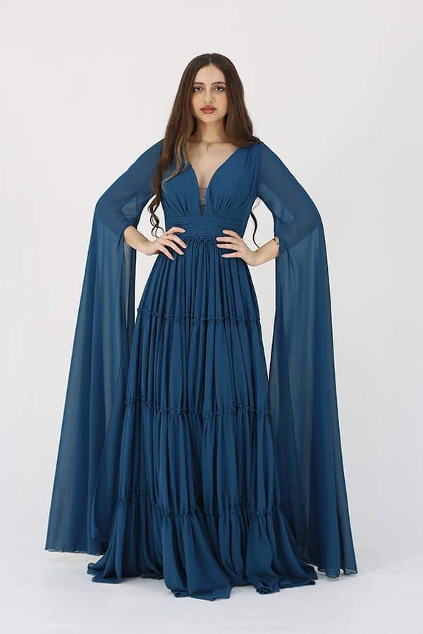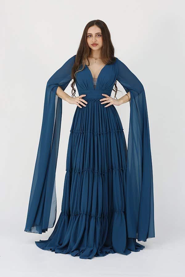 فستان سهره شيفون بأكمام منديل من خامة الشيفون بلونين البترولي والعودي بتصميم طبقات انيقة في الأسفل الصدر لف مع كسرات انيقة مزوم الخصر على طبقات انيق يجمع بين الأناقة والجمال والتفاصيل المميزة لإطلالة ساحرة ومذهلة. ستبدين مثل نجمة السهرة في هذا الفستان الرائع !يتميز الفستان بأكمام منديل، وهي تفاصيل تعطي للفستان لمسة فريدة وأنيقة. يتميز الفستان بتصميم الصدر الانيقة تفاصيل تبرز جمال وأنوثة منطقة الصدر تصميم يعزز التحديد الجميل للخصر ويعطي للفستان مظهرًا أنيقًا ومتناغمًا. يساهم هذا التصميم في إبراز القوام
