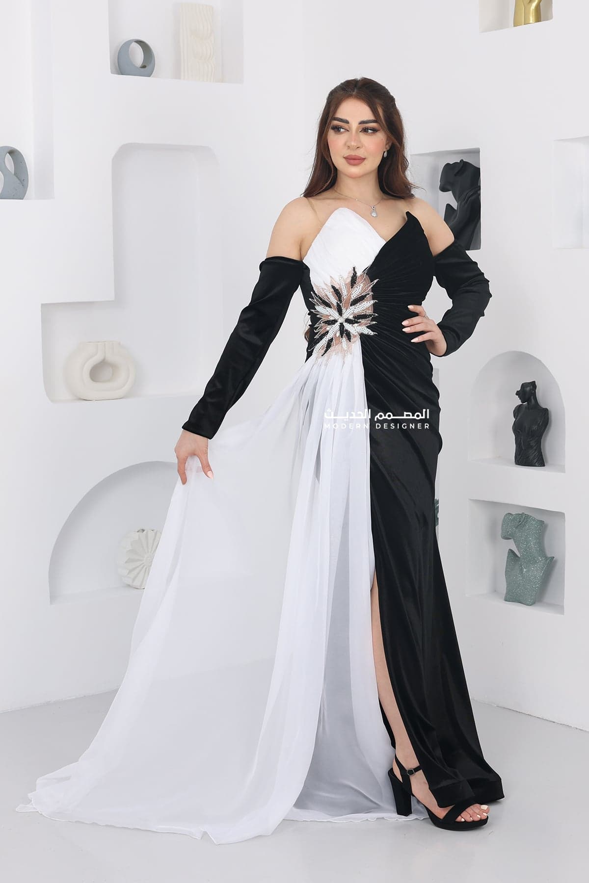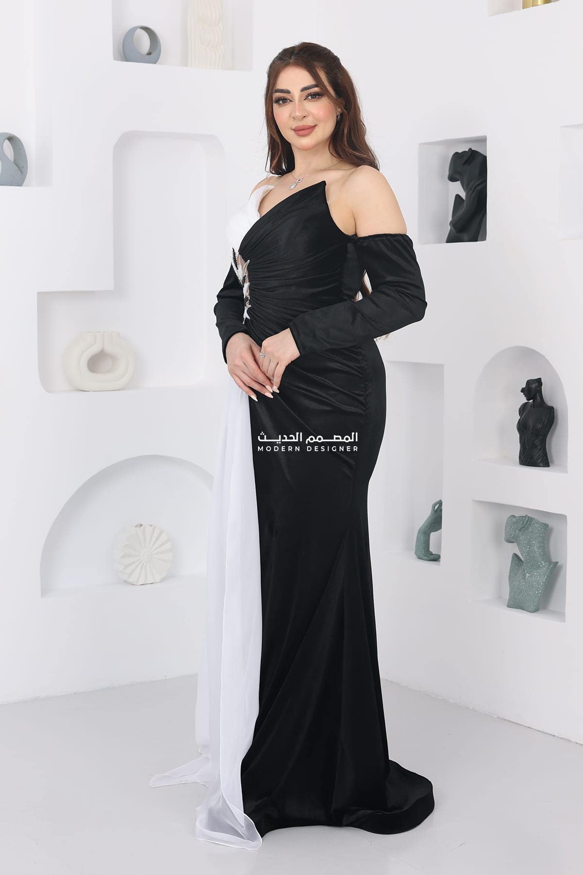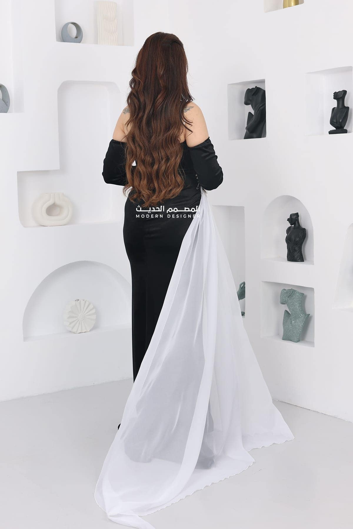 فستان سواريه بتصميم فخم يتميز الفستان بلون ملكي اسود وكما يتميز الفستان بفيونكة على الصدر و تطريز فخم على الخصر مما تجعل الفستان من اجمل التصاميم العالمية يعد قطعة فنية تبرز أناقة وجمال التصاميم العالمية. سيكون اختيارًا رائعًا للمناسبات الخاصة التي تتطلب إطلالة مميزة وجذابة.