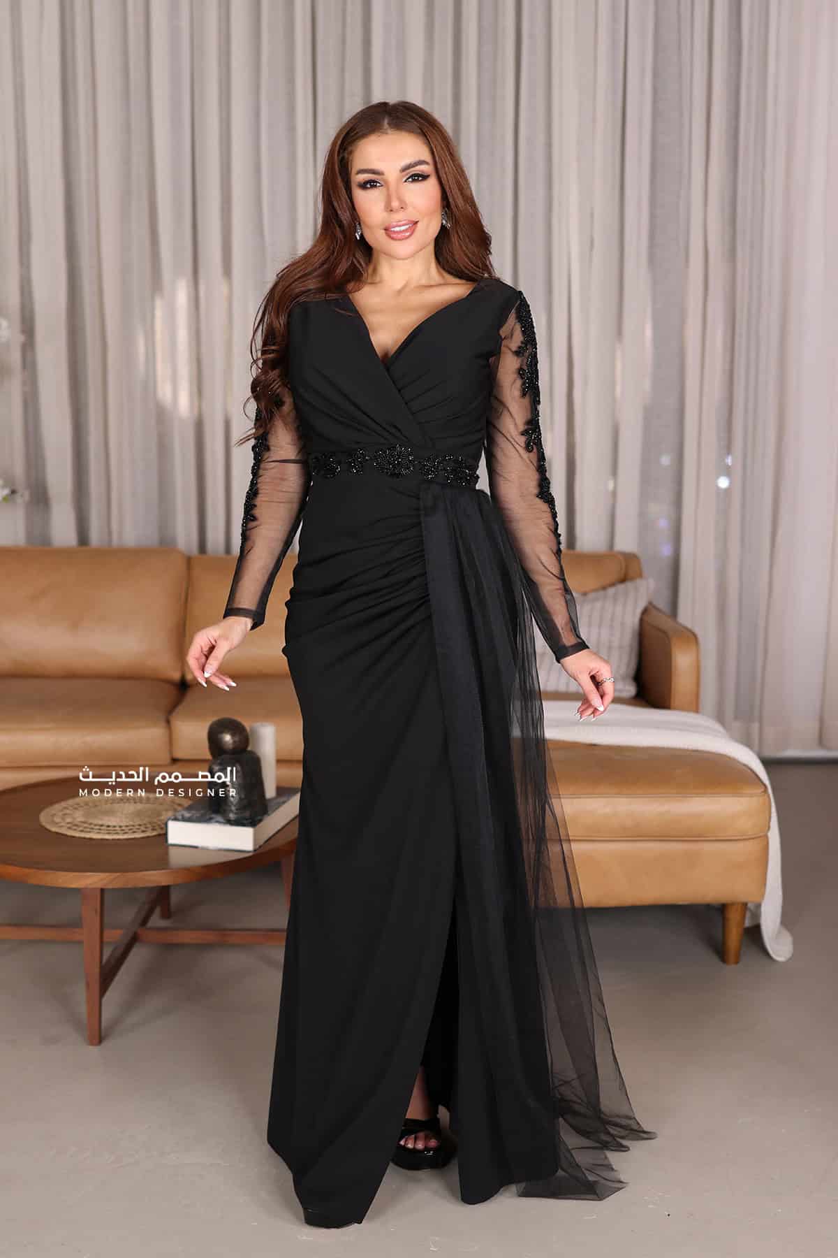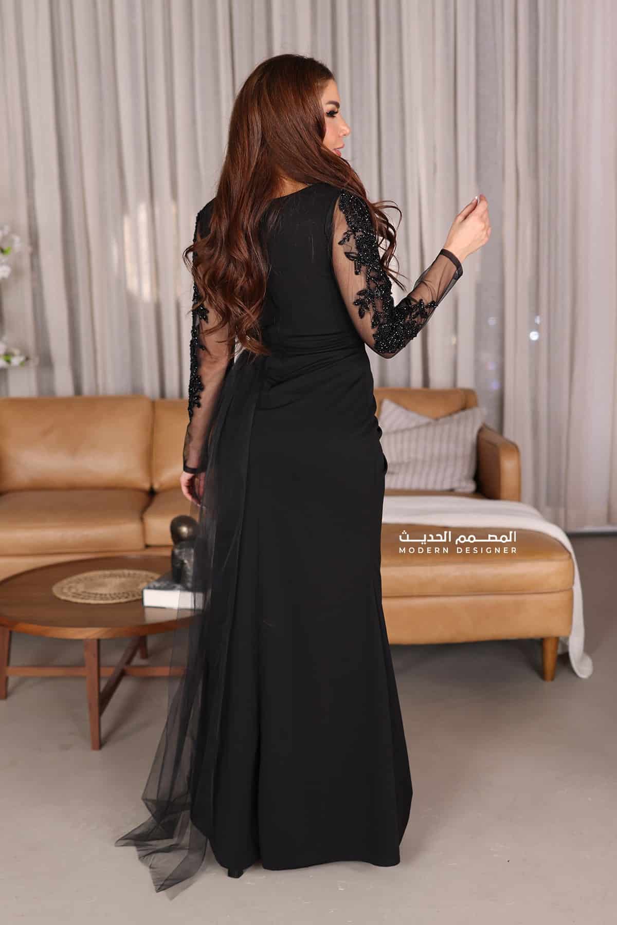 فستان سواريه راقي من خامة الكريب بتطريز على الخصر والاكمام بأكمام شفافة بشال جانبي من خامة التل الفاخر بفتحة اسفل الفستان لتبرز من جمال التصميم صمم هذا الفستان على ايادي خبراء ومصممين عالمين لدى براند المصمم الحديث