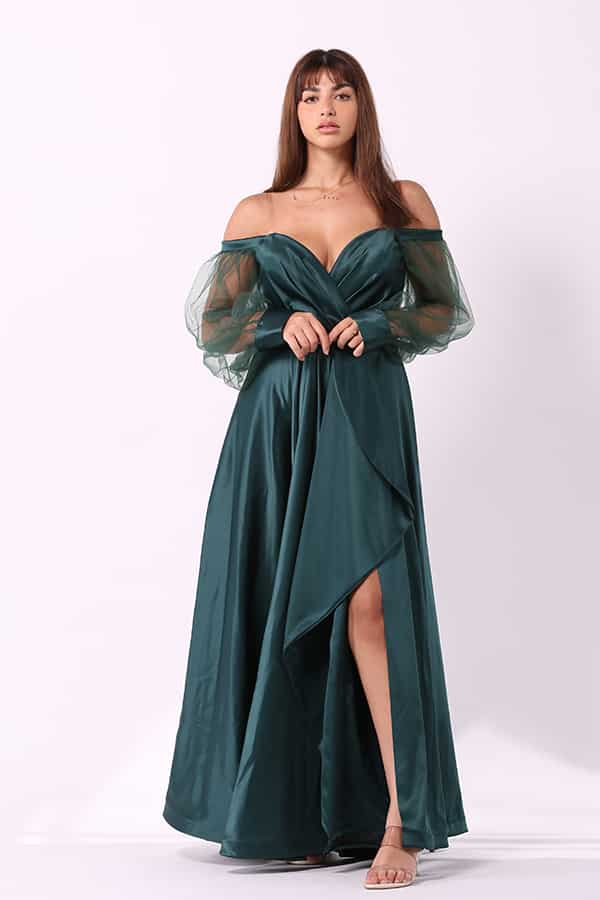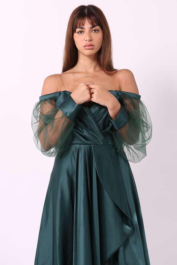 الفستان مزود بأكمام طويلة من التل، ما يضيف إليه لمسة من الأناقة والرقي. الأكمام المصممة بتفاصيل دقيقة تبرز جمال التصميم بطريقة أنثوية، مما يجعلكِ تبدين في غاية الجمال والجاذبية. كما أن الفستان يتميز بفتحة أنيقة تبدأ من منتصف الساق وتصل إلى الأسفل، مما يمنحك مظهراً مثيرًا وأنيقًا في الوقت ذاته.
