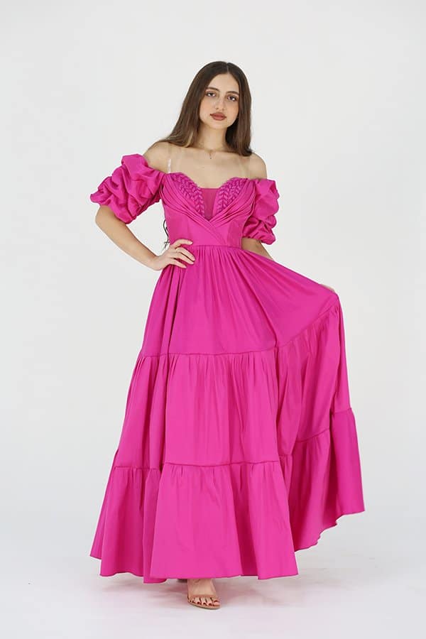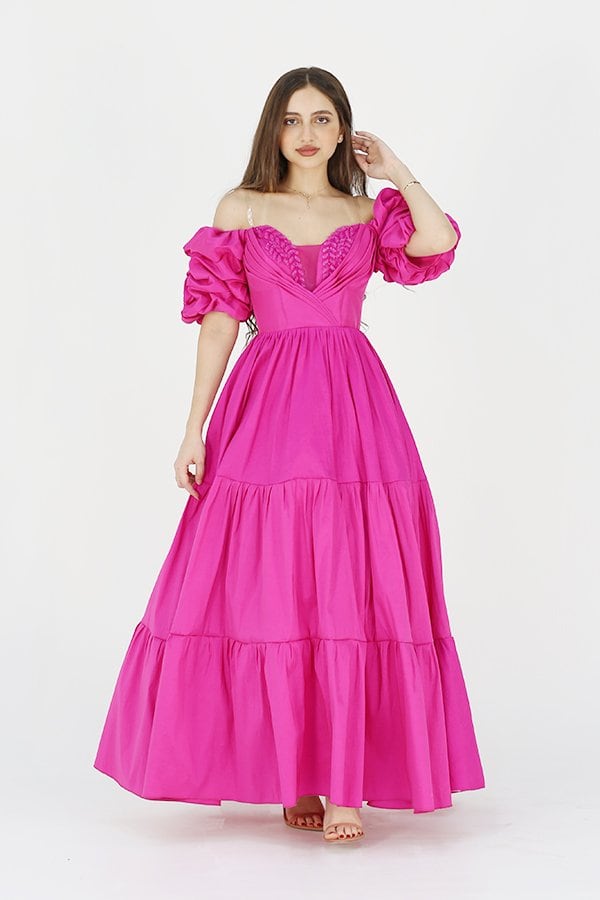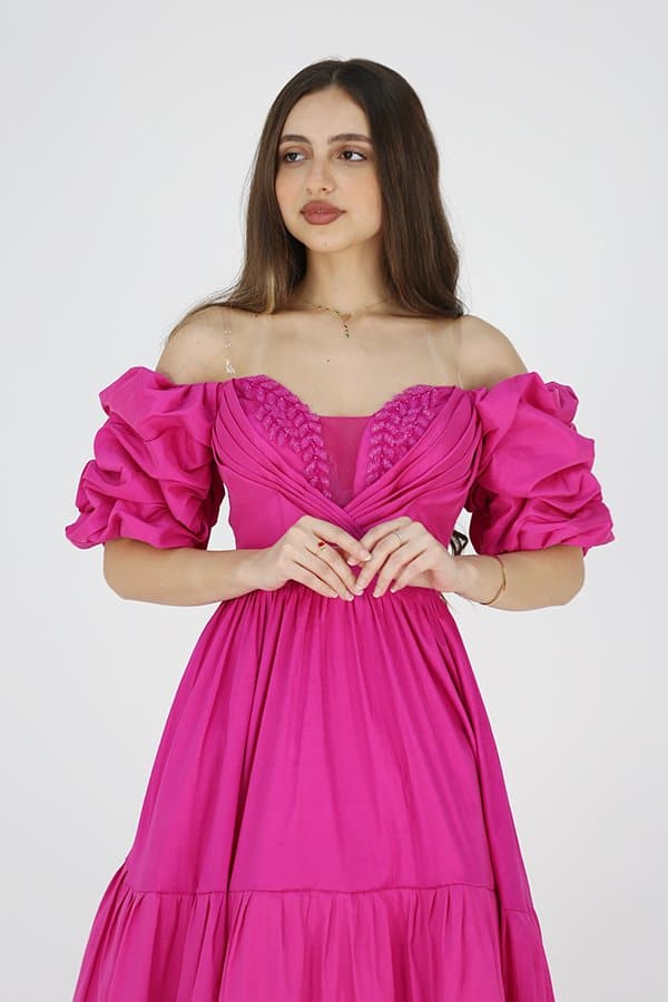 فستان طويل فوشية من خامة التفتا شانتون هو الاختيار المثالي لإطلالة ساحرة ومميزة في مناسبات السهرة الخاصة بفضل خامته اللامعة والناعمة، يضفي الفستان لمسة من الفخامة والأناقة التي تبرز جمالك في كل لحظة. الأكمام النص المنتفخة تضيف إلى التصميم لمسة من التألق، بينما التطريز اليدوي الرائع في منطقة الصدر يضيف لمسة فنية مع تفاصيل دقيقة تجعل الفستان قطعة فريدة من نوعها.