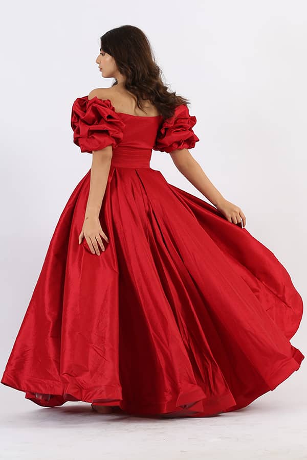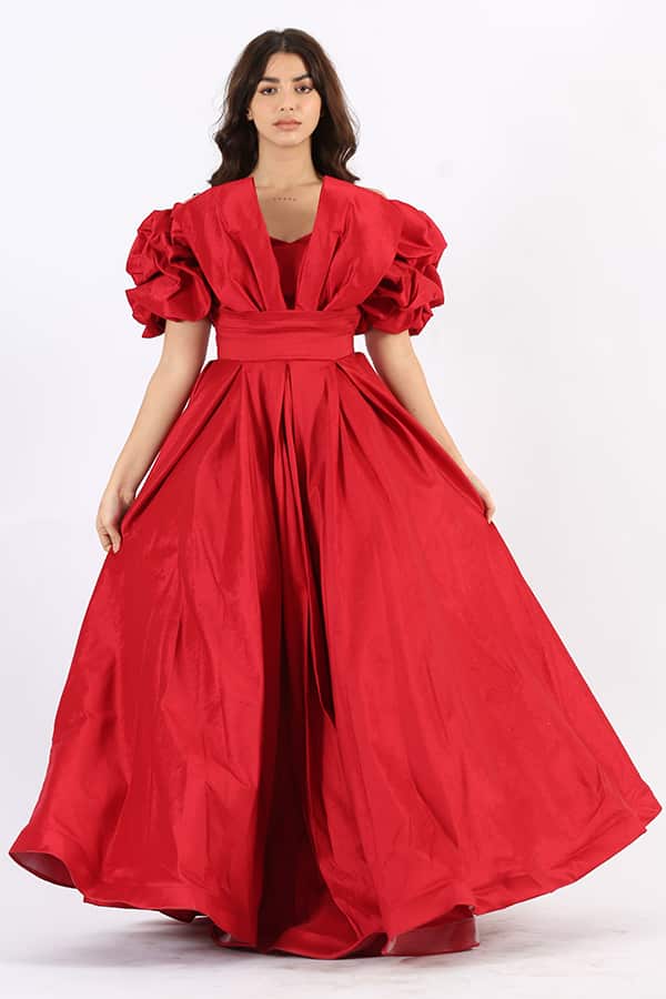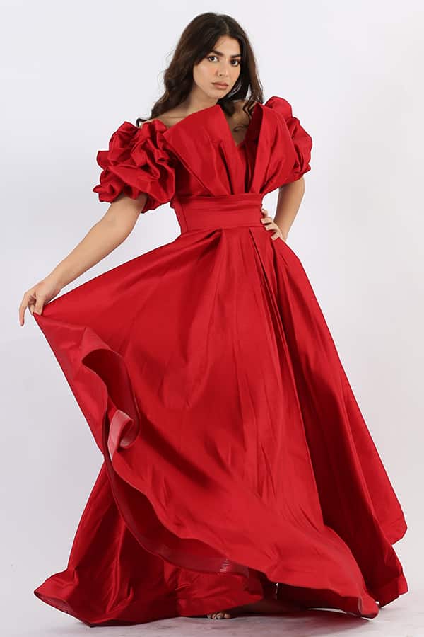 فستان احمر بأكمام نص منفخة هو خيار مثالي لإطلالة ساحرة وأنيقة في أي مناسبة خاصة. مصنوع من خامة التفتا شانتون الفاخرة، يتميز الفستان بلمعة جميلة توفر لكِ مظهرًا فاخرًا وجذابًا. التصميم الأنيق يتضمن كلفة متألقة في الصدر تضيف لمسة من الفخامة والتفرد، ما يجعله يناسب الحفلات والسهرات الفاخرة .يتميز الفستان بقصة الصدر الـ V الأنيقة التي تعزز جمال العنق والكتفين. تعطي هذه القصة للفستان مظهرًا أنثويًا وجذابًا، مما يساعد في إبراز جمال وأناقة الجسم