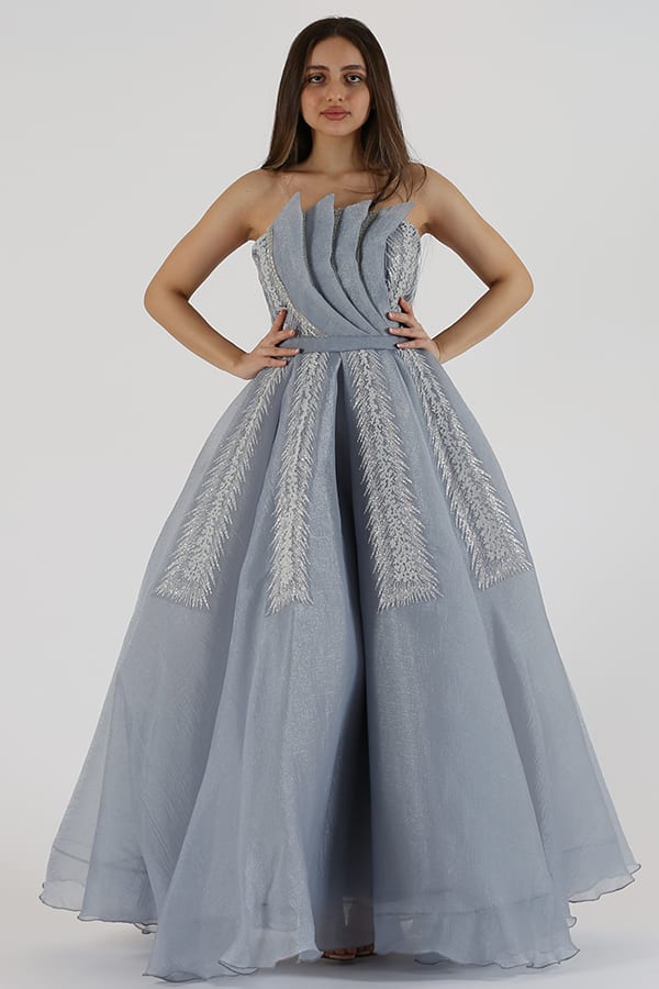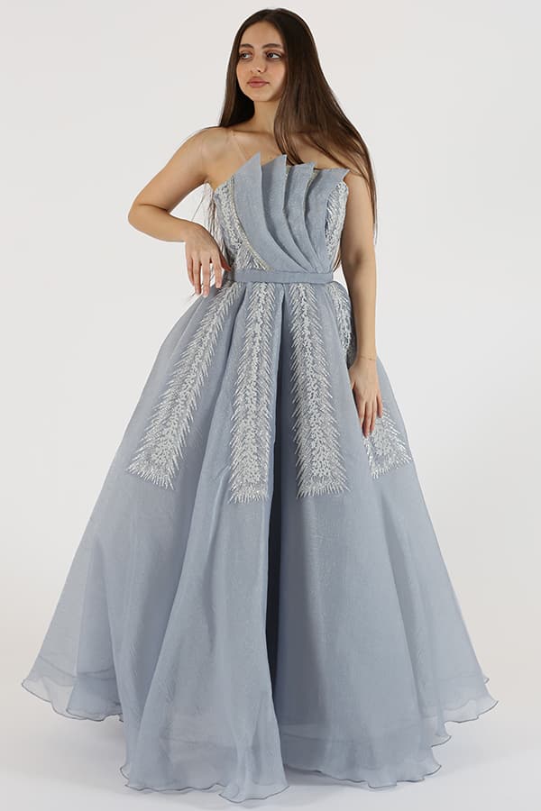 فستان طويل بكسرات انيقة في الصدر مطعم بخيط قصب فضي هو قطعة مثيرة وجذابة تضفي لمسة من الأناقة والتألق على إطلالتك.يتميز الفستان بتصميم مبتكر وعصري. يحتوي على توب سهرة مزود بكسرات أنيقة في منطقة الصدر، وهي تفاصيل ثلاثية الأبعاد تعطي الفستان مظهرًا فريدًا وجذابًا. توفر الكسرات تصميمًا متناغمًا وتعزز جمال الصدر.