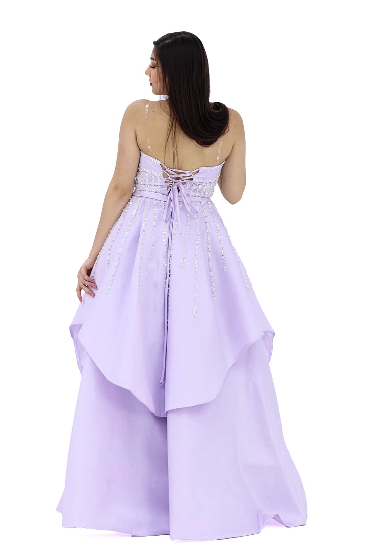 التخزين السليم: قومي بتخزين الفستان في مكان جاف ومنعزل عن الرطوبة للحفاظ على جمال الكريستالات والإكسسوارات.