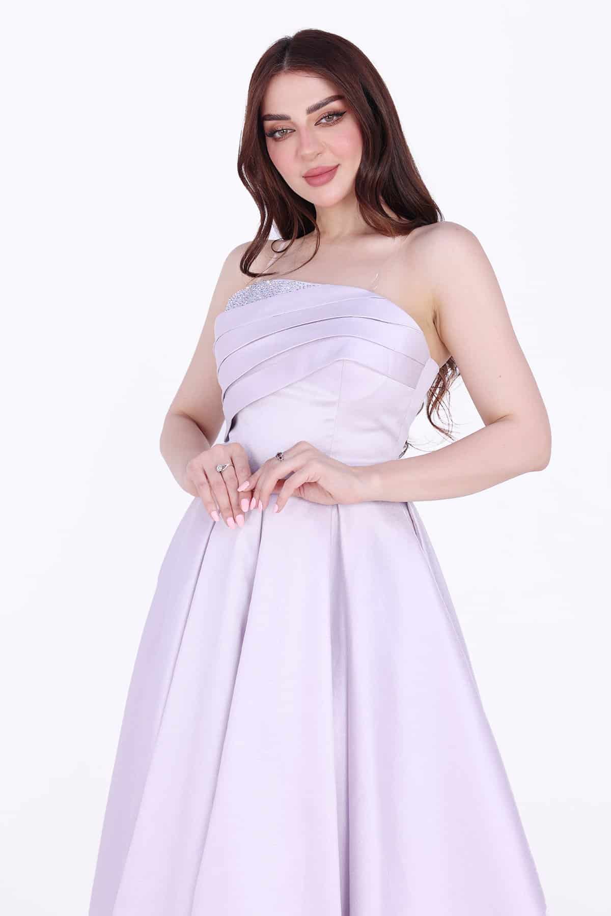 التخزين السليم: قومي بتخزين الفستان في مكان جاف ومنعزل عن الرطوبة للحفاظ على جمال الكريستالات والإكسسوارات.
