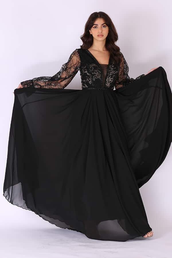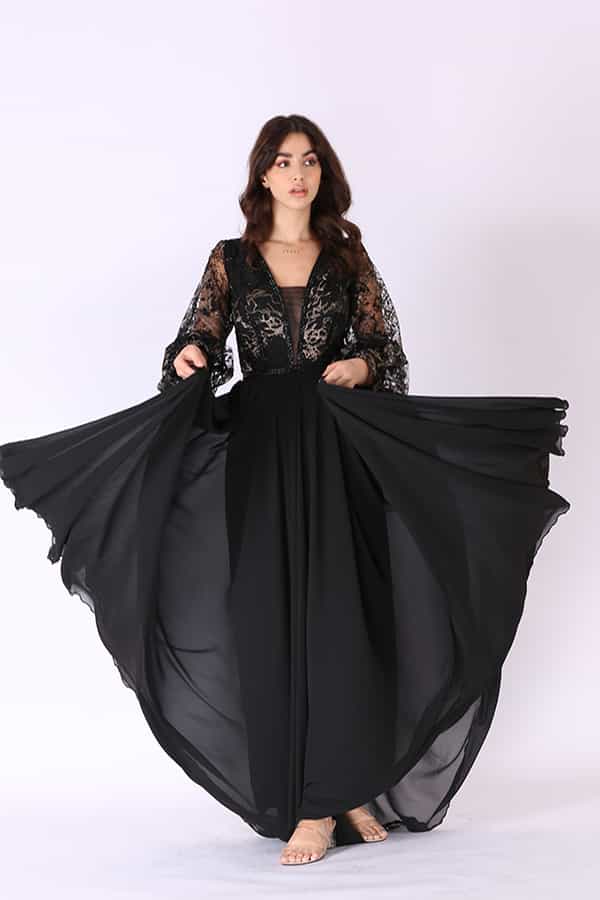 فستان سهرة طويل كلاسيك من خامة الشفون بأكمام طويلة واسعه بقصة الV الأنيقة يتميز الفستان بتصميم انيق مما يضفي لمسة من الرقي والأناقة على الإطلالة. يتم صنع الفستان من خامة الشيفون، وهي خامة خفيفة وشفافة تعطي للفستان مظهرًا رقيقًا وأنيقًا. توفر الشيفون حركة وتدفقًا جميلًا للفستان عند التحرك.