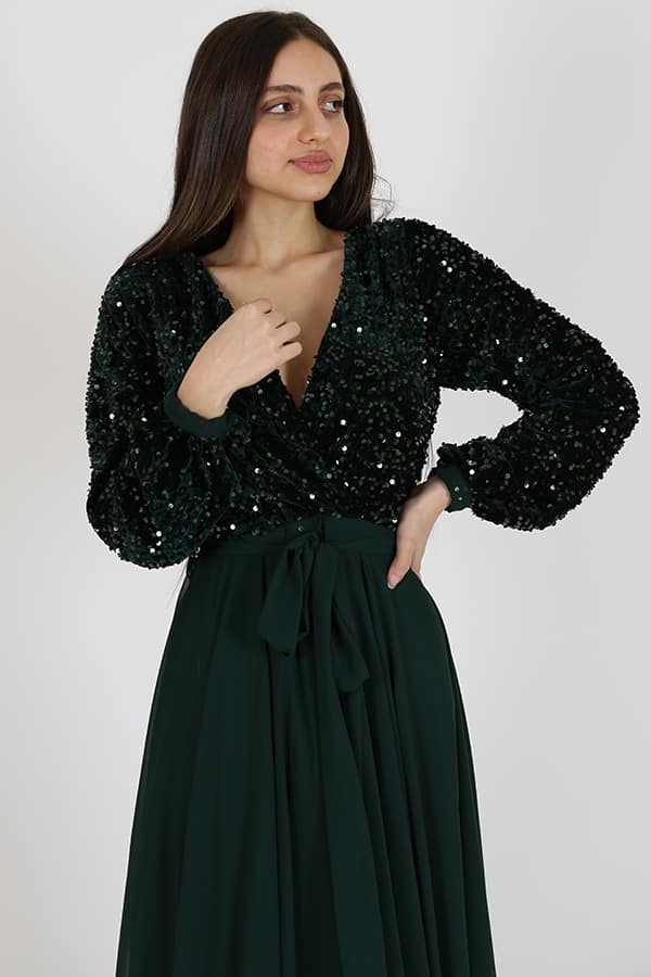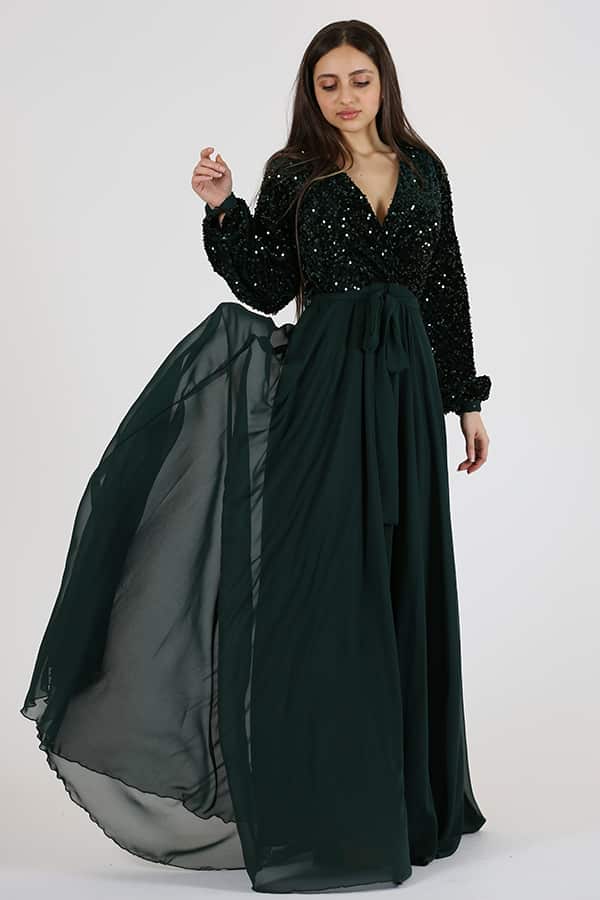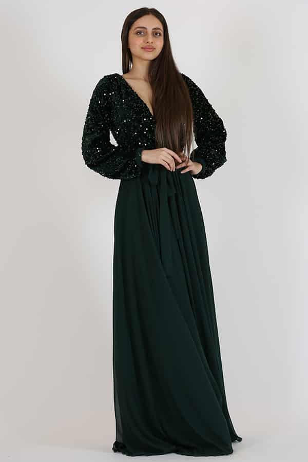فستان طويل سهرة بأكمام طويلة المصنوع من خامة الترتر وخامة الشيفون بأكمام طويلة هو قطعة فاخرة وساحرة تضفي لمسة من التألق والأناقة على إطلالتك تتضمن التفاصيل المميزة للفستان تطريزات من الترتر على الصدر وقد تكون هناك تفاصيل بسيطة أو أحزمة رفيعة تزيّن الخصر لتحديد القوام وإبراز الجمال الأنثوي. يتميز الفستان بأكمام طويلة تضفي لمسة من الرقة والأناقة. تغطي الأكمام الطويلة الذراعين وتضفي لمسة من السحر والأنوثة على الإطلالة، كما أنها توفر توازنًا مثاليًا مع طول الفستان. ستحصلين على إطلالة فاخرة وساحرة عند ارتداء هذا الفستان. سيتميز بأناقتك وجاذبيتك وستلفتين الأنظار في أي مناسبة خاصة تحضرينها.