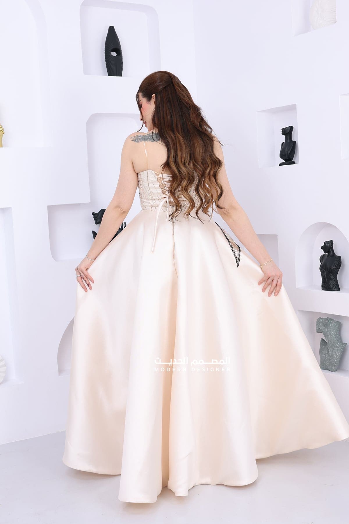 التعامل بحذر: عند ارتداء وخلع الفستان، تجنبي السحب الشديد والتعامل الخشن الذي قد يؤدي إلى تلف الكريستالات والإكسسوارات.