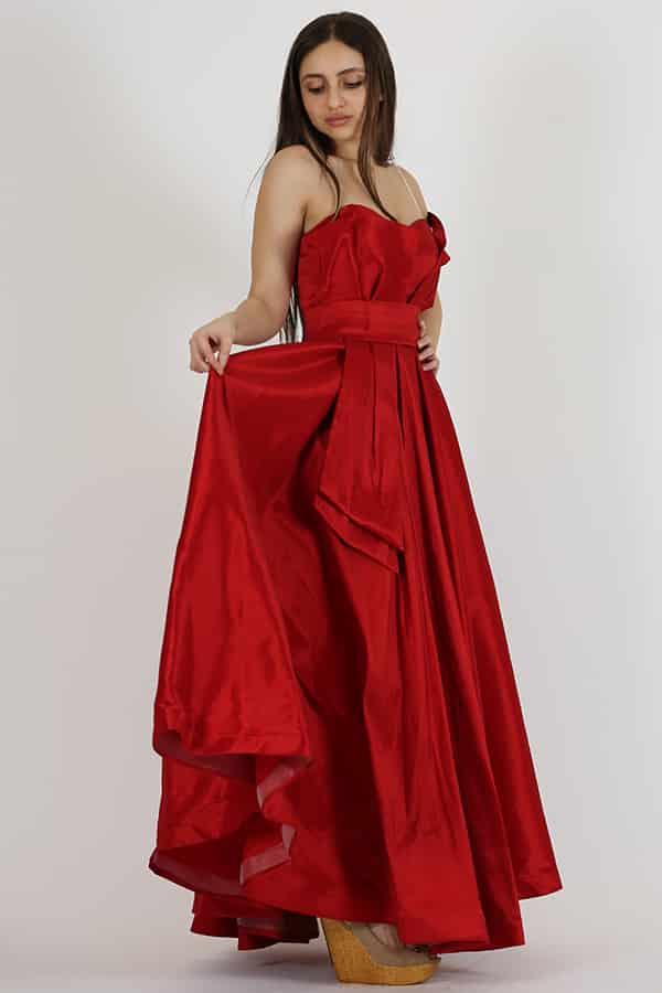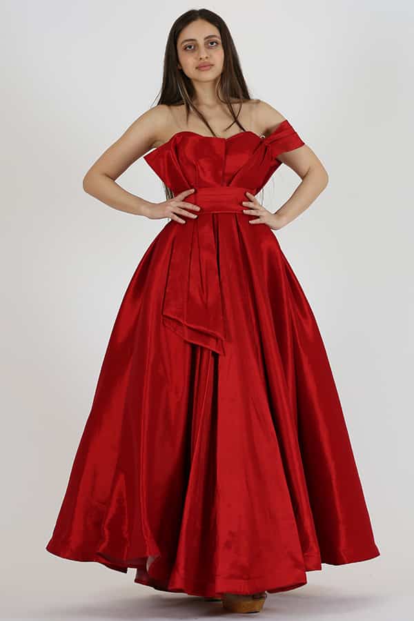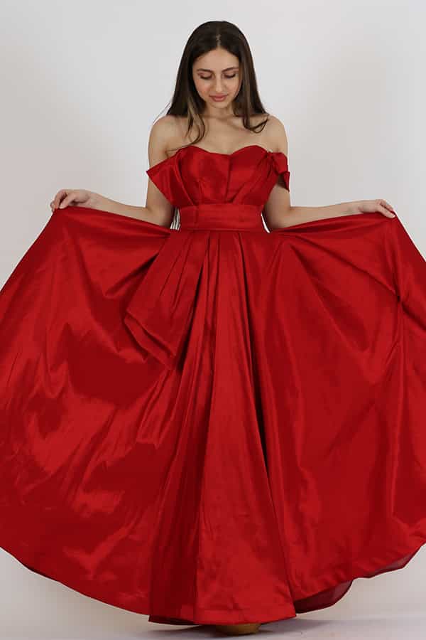 الأناقة: يعكس فستان السهرة المصنوع من خامة التفتا شانتون الأناقة والفخامة. تتميز هذه الخامة بملمسها الناعم والمخملي، ولمعانها الفاخر،