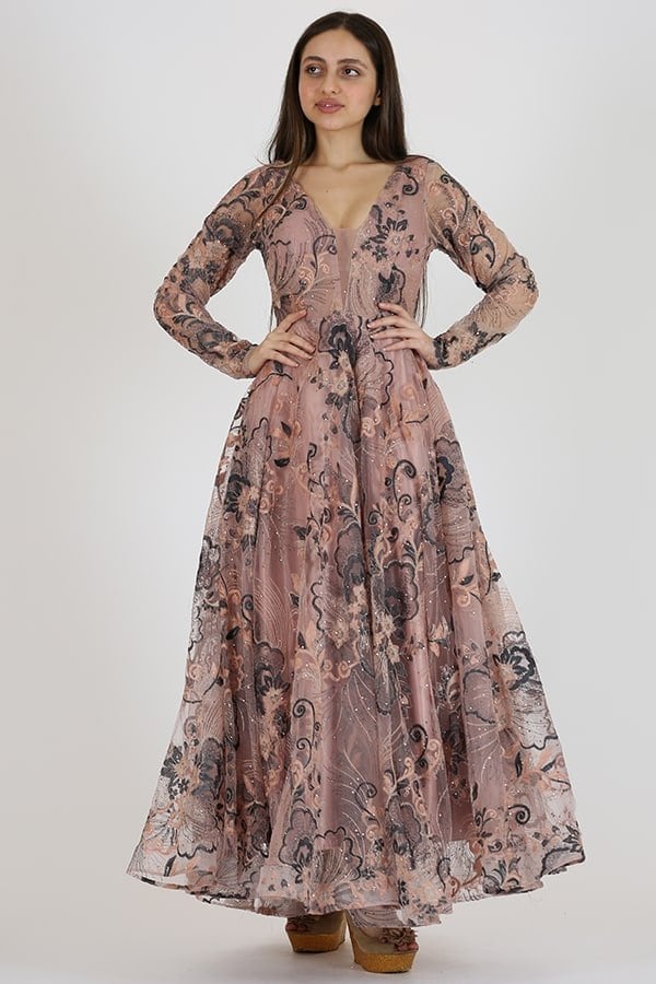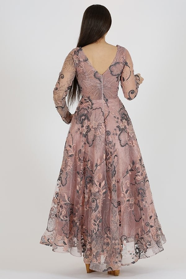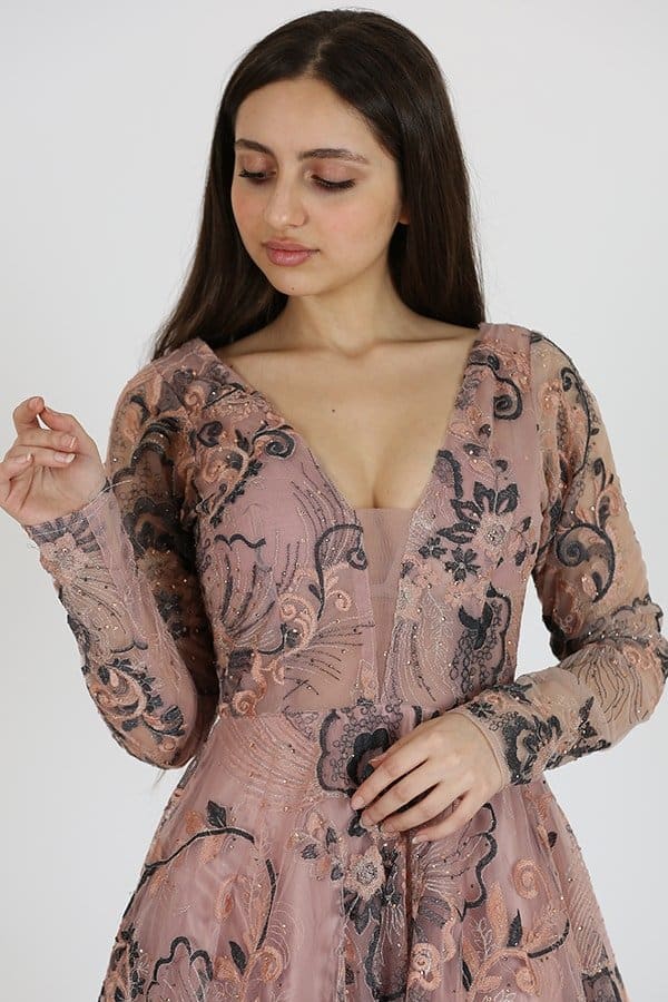 فستان سهرة فخم مشجر من خامة التل كمبيوتر وهي خامة ذات لمعة وتأثير ثلاثي الأبعاد تعطي للفستان مظهرًا فاخرًا ومميزًا. تتداخل الأشجار والأزهار بأكمام طويلة مميز بقصة الـV الأنيقة على قصة كلوش .يحتوي الفستان على أكمام طويلة وأنيقة تصل إلى المعصم، مما يعزز الأناقة والفخامة العامة للفستان. تبرز الأكمام الطويلة جمال الذراعين وتعزز الأناقة والجاذبية العامة للإطلالة.
