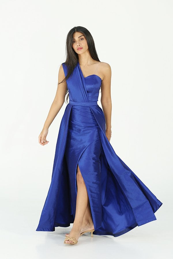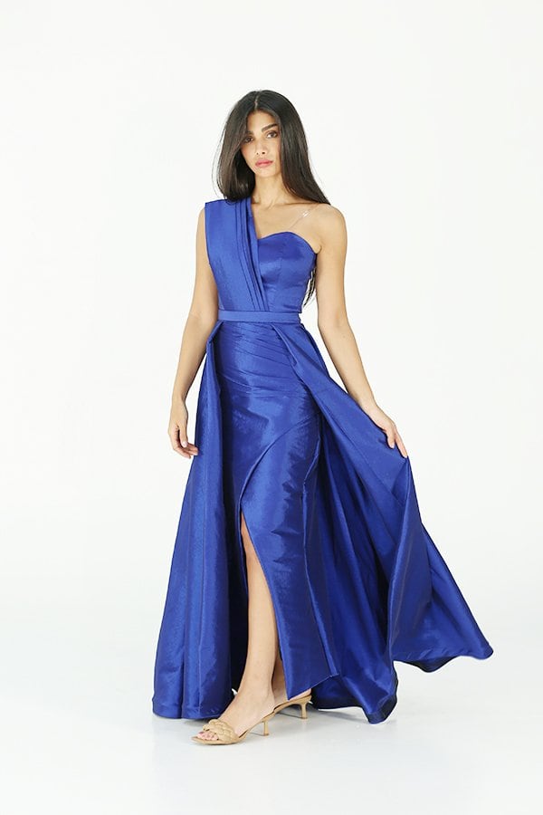 فستان طويل نيلي كتف واحد بأناقة ساحرة في مناسباتك الخاصة مع هذا الفستان الفريد الذي صممه المصمم الحديث. مصنوع من قماش الشانتون الفاخر، يجمع الفستان بين الرقي والتفرد بتصميمه الروماني الأنيق. الكسرات الممتدة من الخصر إلى الكتف تضفي على الفستان لمسة من الحركة والديناميكية، مما يعزز من جمالية التصميم ويبرز منحنيات الجسم بشكل رائع.