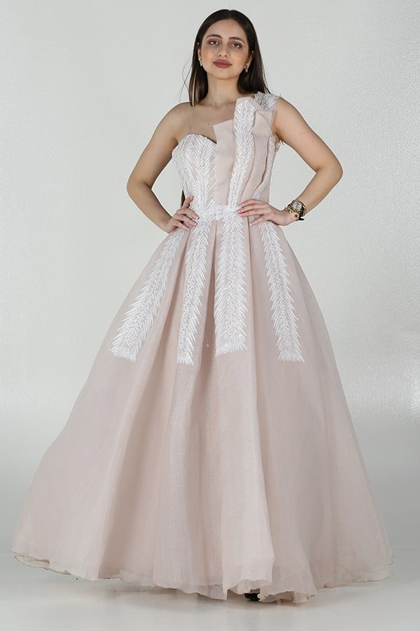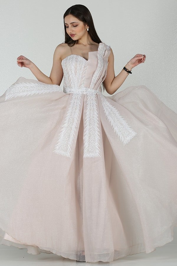 فستان سهرة بتصميم روماني مميز كتف واحد بشكل جميل صمم لإطلالتك الجذابة لتسحري من حوالك بجمال اناقتك قد يتميز الفستان بقصة ضيقة حول الصدر والخصر لتبرز جمال القوام وتعطي شكلًا ممشوقًا وأنثويًا. تأتي الحمالة الواحدة بتصميم مبتكر يجذب الانتباه إلى الكتف والرقبة، مما يعطي للفستان لمسة جريئة وجميلة.