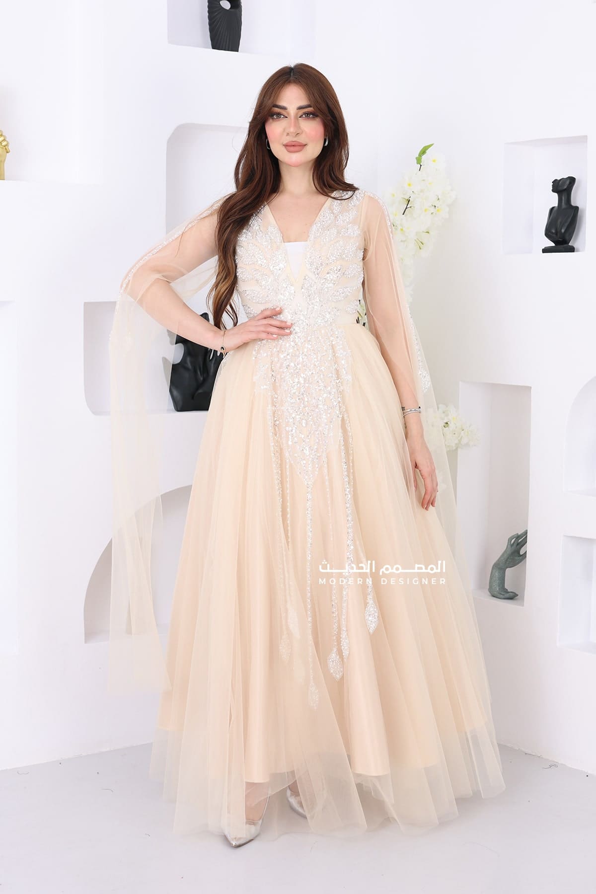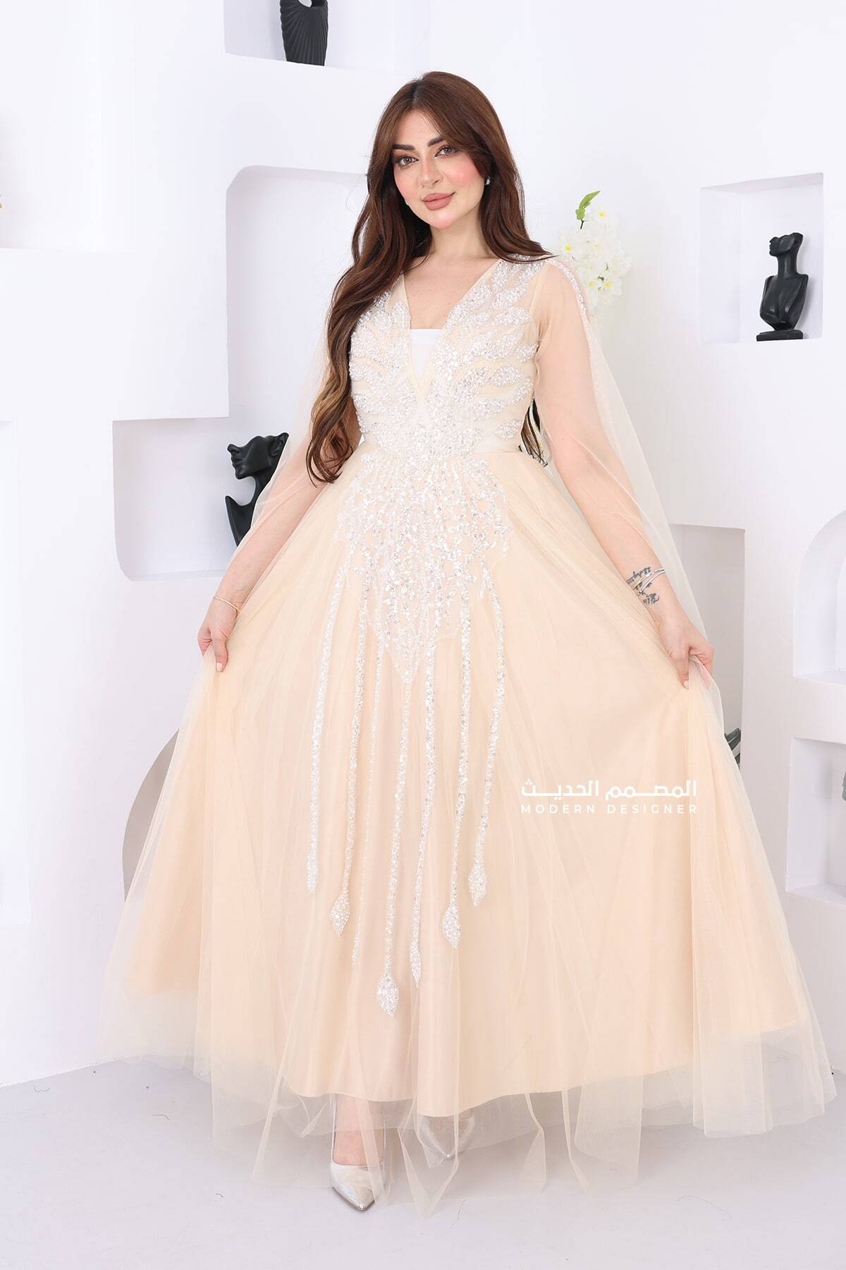 فستان فاخر للمناسبات من التل بتطريز فضي لإطلالة تخطف الأنظار في كل مناسبة تميّزي في مناسباتك بإطلالة راقية لا تُنسى مع فستان سهرة فخم من خامة التل، صُمم بعناية ليتناسب مع ذوق المرأة السعودية اللي تحب اللمسات الفاخرة والتفاصيل الناعمة. الفستان يجي بتطريز فضي أنيق على منطقة الصدر والخصر، يمتد بشكل انسيابي إلى أسفل الفستان، ليعطيك مظهر ملوكي يلفت الأنظار بكل خطوة. قصة الرقبة المفتوحة تضيف لمسة أنوثة وجاذبية، أما الأكمام المصنوعة من التل المفتوح فهي تعطي طابع ناعم وراقي يميزك عن الكل. هذا التصميم المثالي يخلي الفستان خيار رائع لكل المناسبات،يضمن لك طلة متكاملة تلفت الأنظار بكل أناقة.