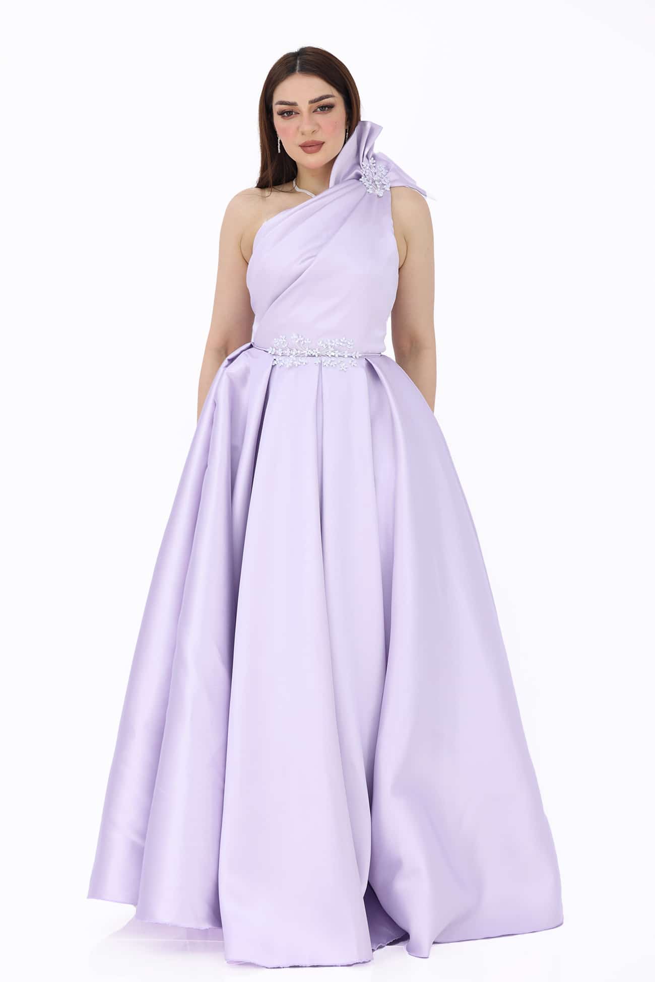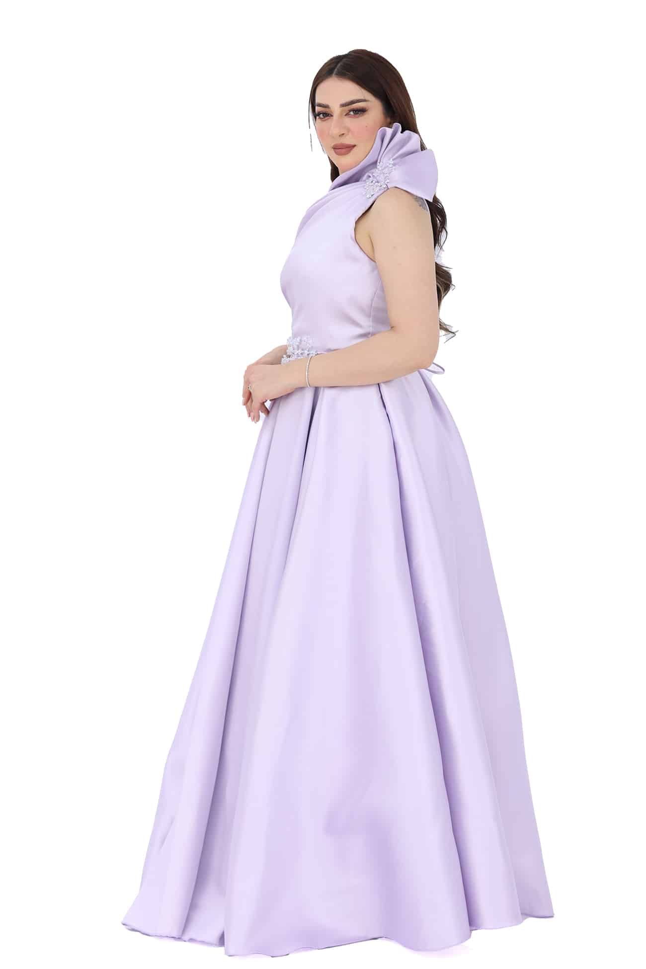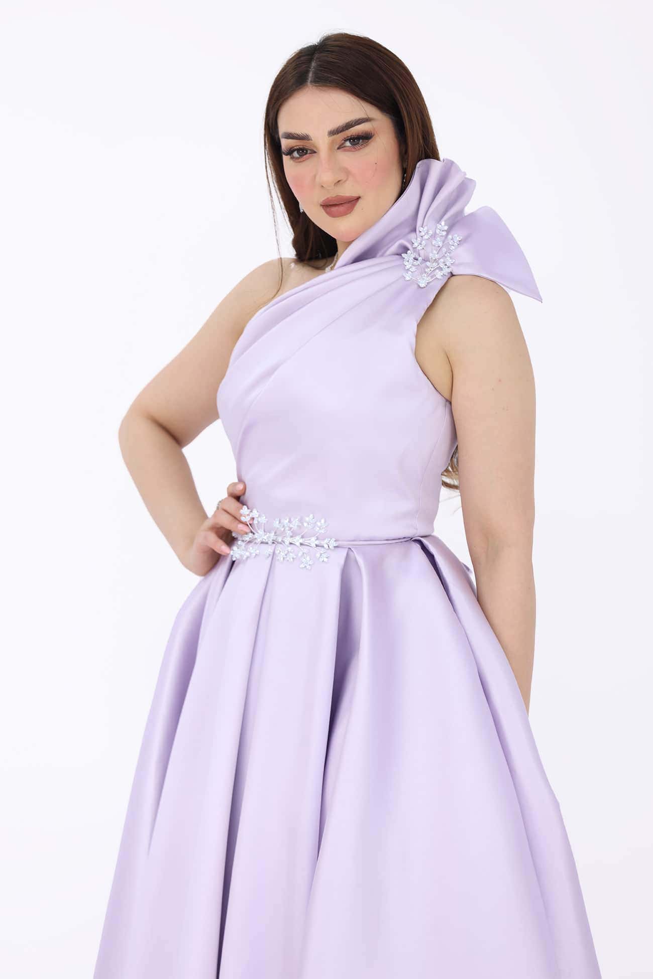 فستان فخم بفونكة باللون الموف من خامة الميكادو بكسرات انيقة بالأسفل يتميز الفستان بكرستال على الفيونكه والخصر مما يجعل الفستان اكثر جمالا قطعة فاخرة وجميلة. يتميز بتفاصيل الكسرات الأنيقة والفونكة المزينة بالكرستالات، مما يجعله يبرز بأناقة ويزيد من جماله. إن اللون الموف المذهب والخامة اللامعة تضفيان لمسة من الفخامة والتألق على هذا الفستان. ستشعرين بالثقة والجمال عند ارتداءه، وسيكون الخيار المثالي للمناسبات الرسمية والسهرات التي تتطلب الأناقة والجمال.يضفي وجود الكرستالات على الفيونكة والخصر لمسة من التألق والجمال على الفستان. تعكس الكرستالات الضوء بريقًا رائعًا وتجعل الفستان يلفت الأنظار بشكل خاص.