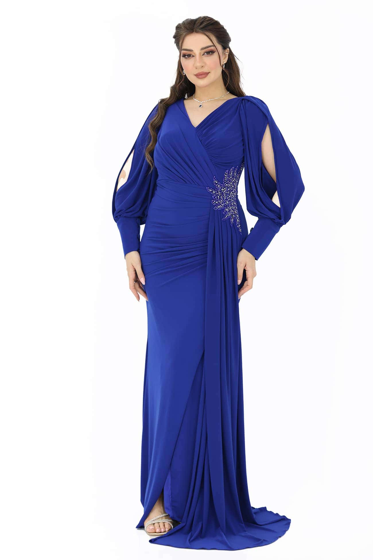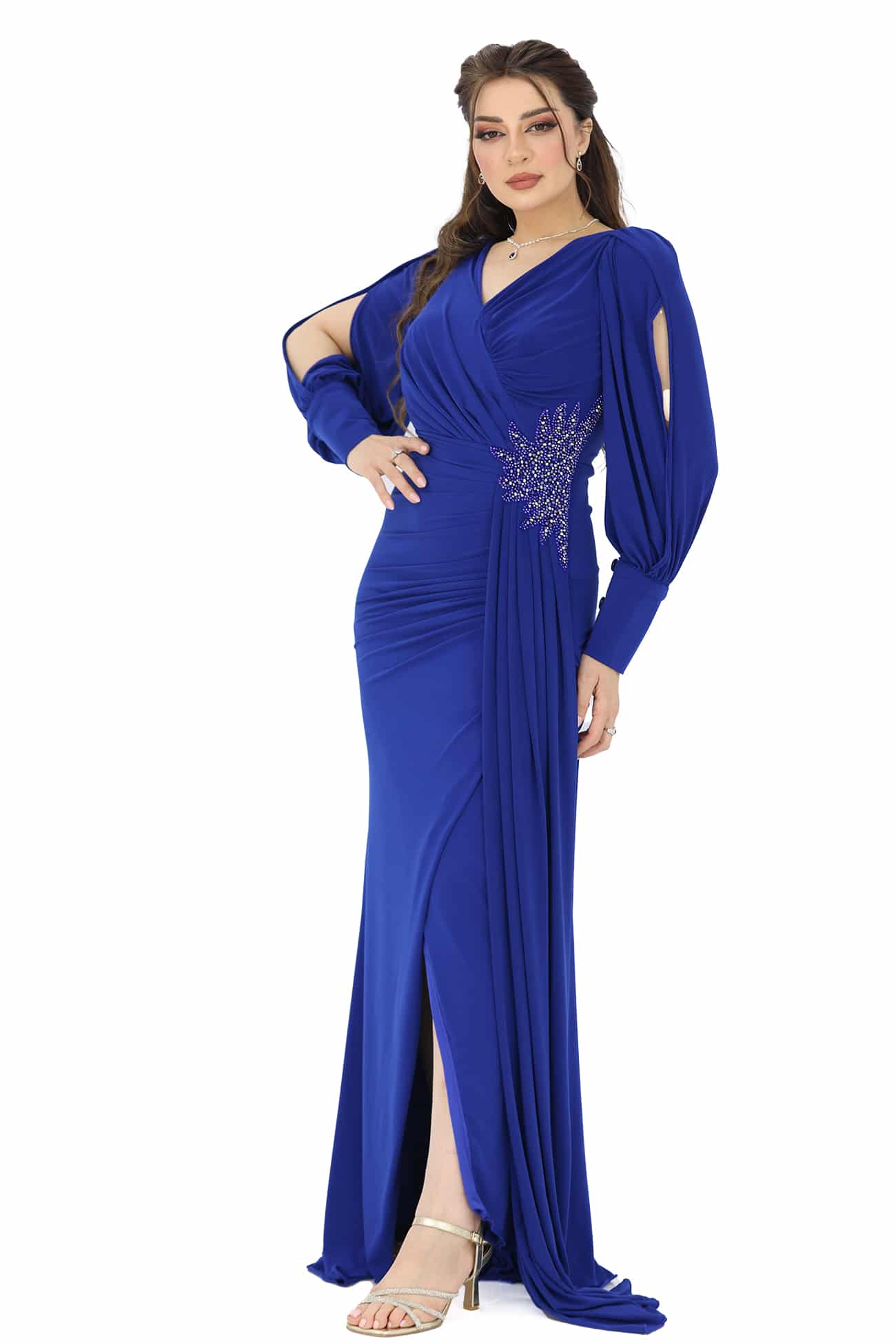 فستان مناسبات بتطريز جانبي بأكمام طويلة مفتوحة بتطريز شك بشال جانبي انيق بفتحة اسفل الفستان يتميز الفستان بقصة الصدر اللف يتميز بتطريز جانبي مذهل يضفي لمسة من الفخامة والجمال على التصميم. تفاصيل التطريز تضفي لمسة من الأناقة والتميز على الفستان، وتعكس الدقة والحرفية في الصنع. الأكمام الطويلة المفتوحة تضفي لمسة ساحرة ومثيرة على الفستان. توفر هذه الأكمام حرية الحركة وتترك الجلد يظهر بشكل جميل. تفاصيل التطريز على الأكمام تضيف لمسة من السحر والأناقة، مما يجعلها تتألق بشكل ملفت للنظر.