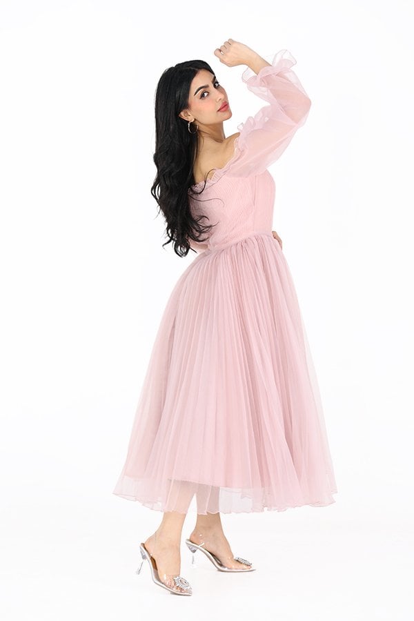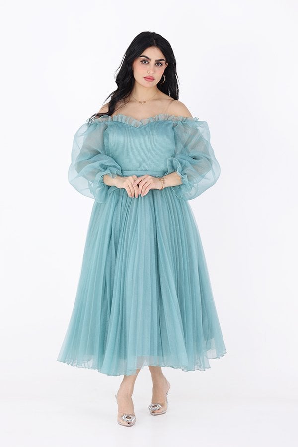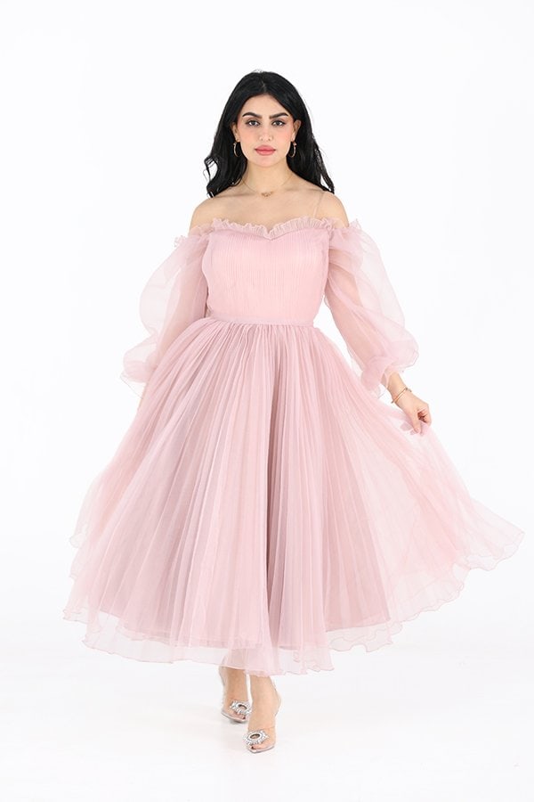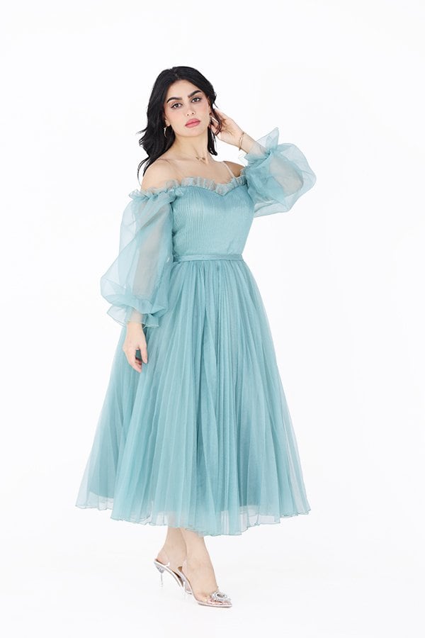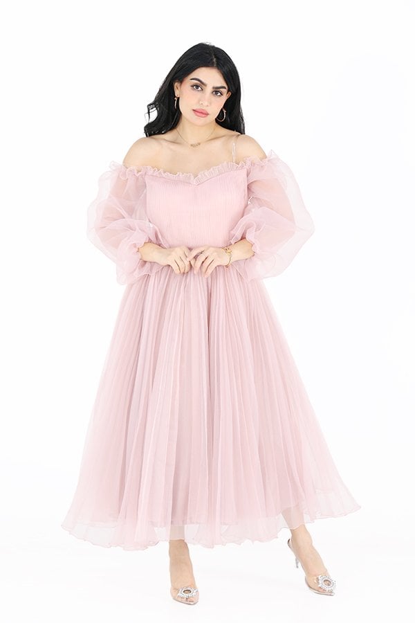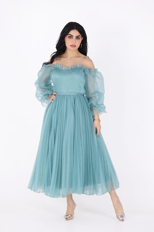 الفتي الأنظار في مناسبتك الكبيرة القادمة بهذا الفستان المصنوع من خامة الجازار المميز بأكمام حيران بتصميم مكشوف الكتفين