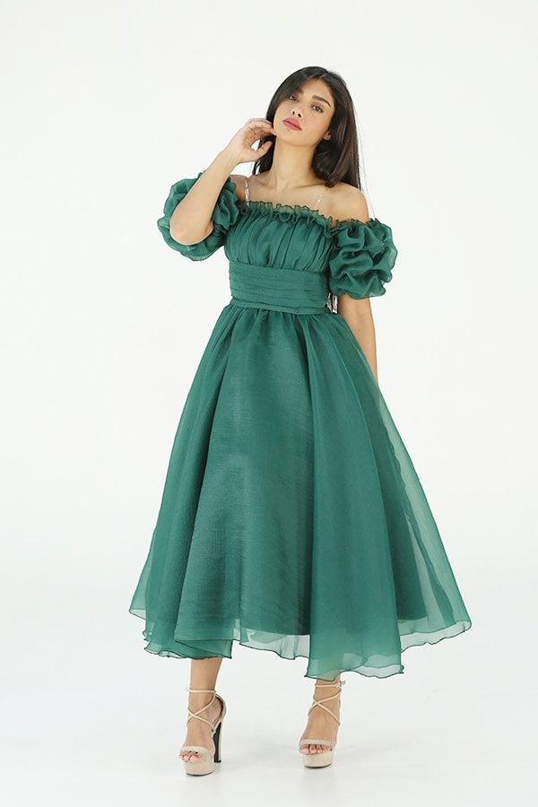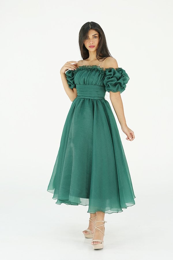 فستان سهرة زيتي ميدي هو اختيار مثالي للمناسبات التي تتطلب إطلالة تجمع بين الأناقة والعصرية. يتميز الفستان بتصميم مميز من الخصر المزموم، الذي يبرز جمال القوام ويمنحكِ إطلالة متناسقة وأنيقة. الكسرات المضافة في التصميم تضفي حركة رائعة على الفستان، مما يزيد من جاذبيته وأناقة ارتدائه.