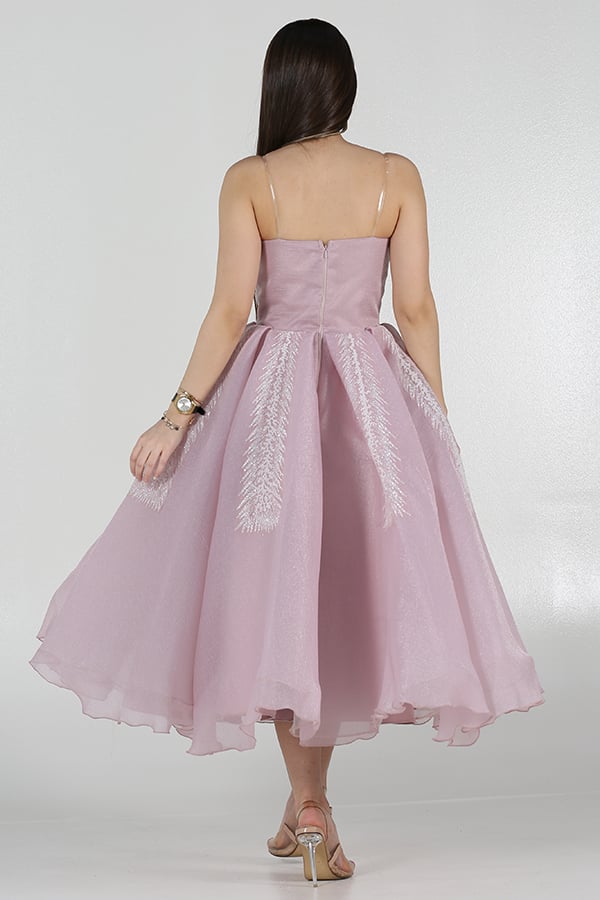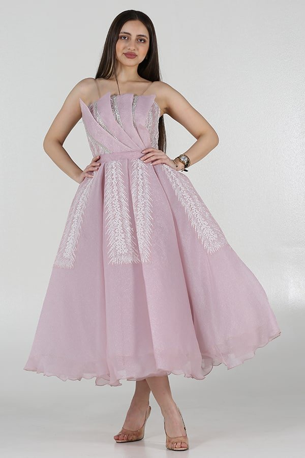 خامة البيليسية تضيف لمعة جذابة على الفستان، مما يجعله يبرز في الضوء ويضيف لمسة من الفخامة. القصة الميدي تمنحكِ مظهرًا أنيقًا وشبابيًا، بينما يبرز الشكل العام للفستان تألقكِ ويمنحكِ إطلالة راقية وجذابة.