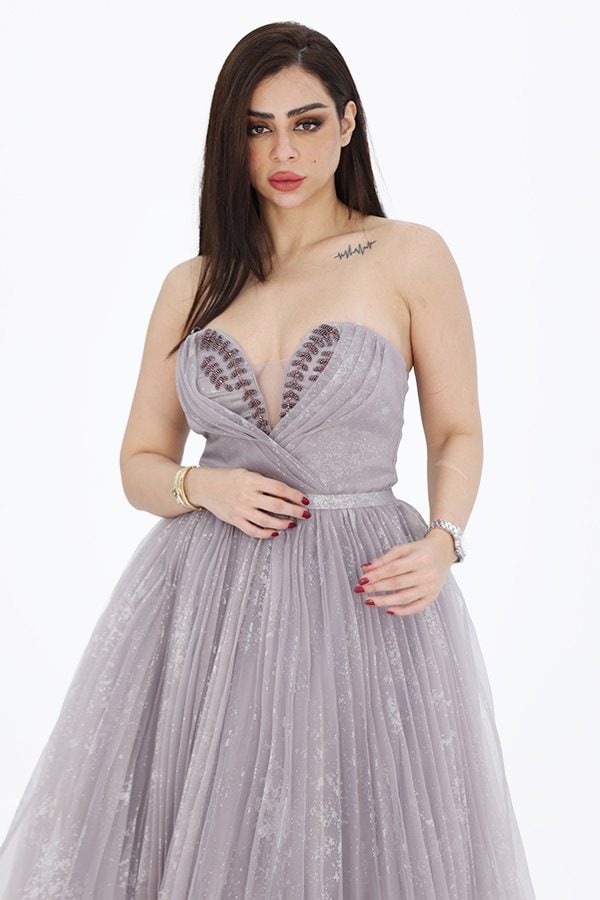 التخزين السليم: قومي بتخزين الفستان في مكان جاف ومنعزل عن الرطوبة للحفاظ على جمال الكريستالات والإكسسوارات.
