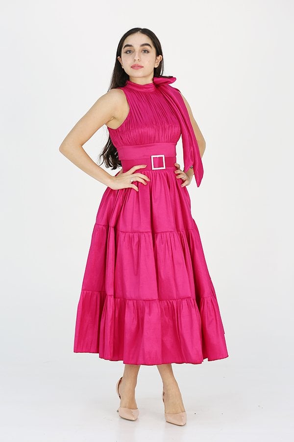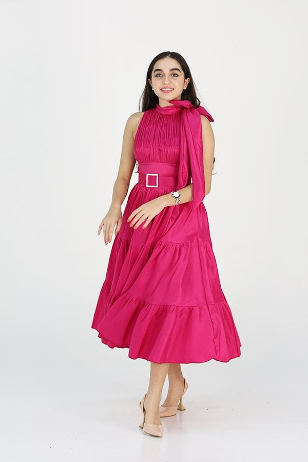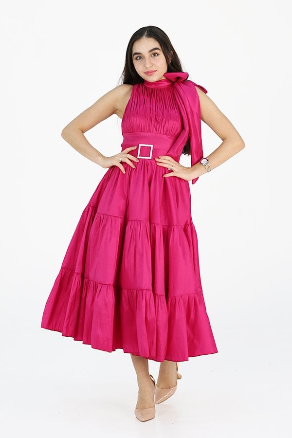 الفستان يحتوي على فيونكة أنيقة مع طبقات مميزة في الأسفل تضيف إلى التصميم حركة وحيوية، مما يجعله مثاليًا لإطلالة تجمع بين البساطة والفخامة. كما يأتي مزودًا بحزام أنيق يساهم في ضبط القياس بشكل مريح ويبرز الخصر بطريقة أنثوية جذابة. تصميمه الجميل وتفاصيله المميزة تجعل منه قطعة رائعة لا غنى عنها في خزانة كل امرأة تبحث عن التميز.