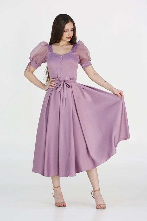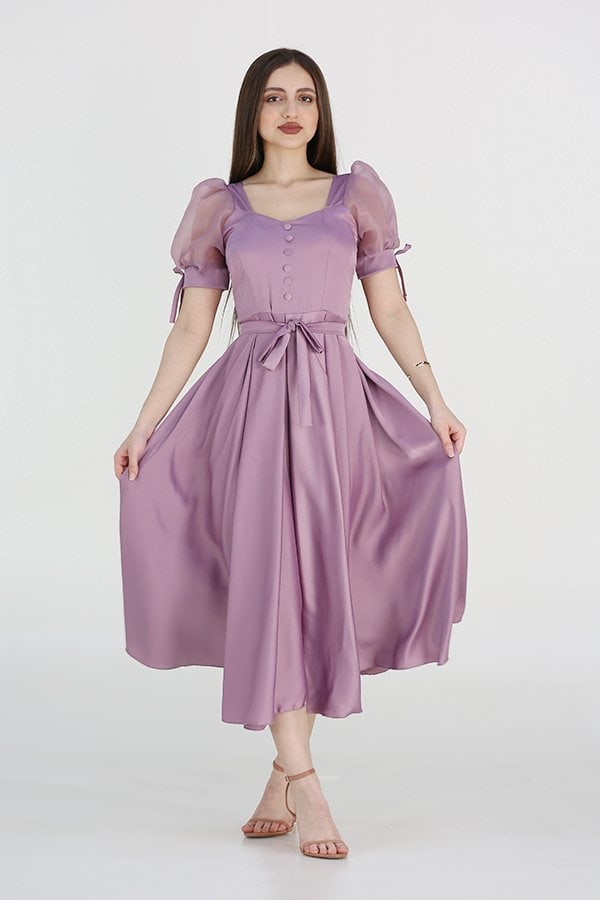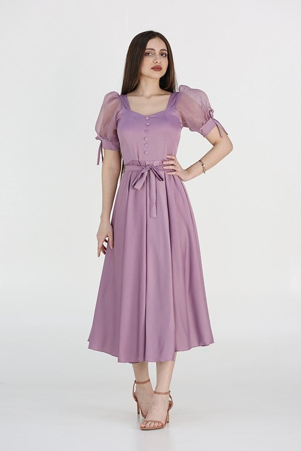 التفاصيل التي تميز هذا الفستان لا تقتصر فقط على الحزام الرفيع في الخصر، بل تشمل أيضًا الأكمام النصفية الأنيقة التي تضفي لمسة من الجمال والنعومة على التصميم. هذه اللمسات المتقنة تجعل من الفستان قطعة فريدة تعكس ذوقك الرفيع، مما يجعلك تتمتعين بإطلالة مميزة في كل مناسبة.