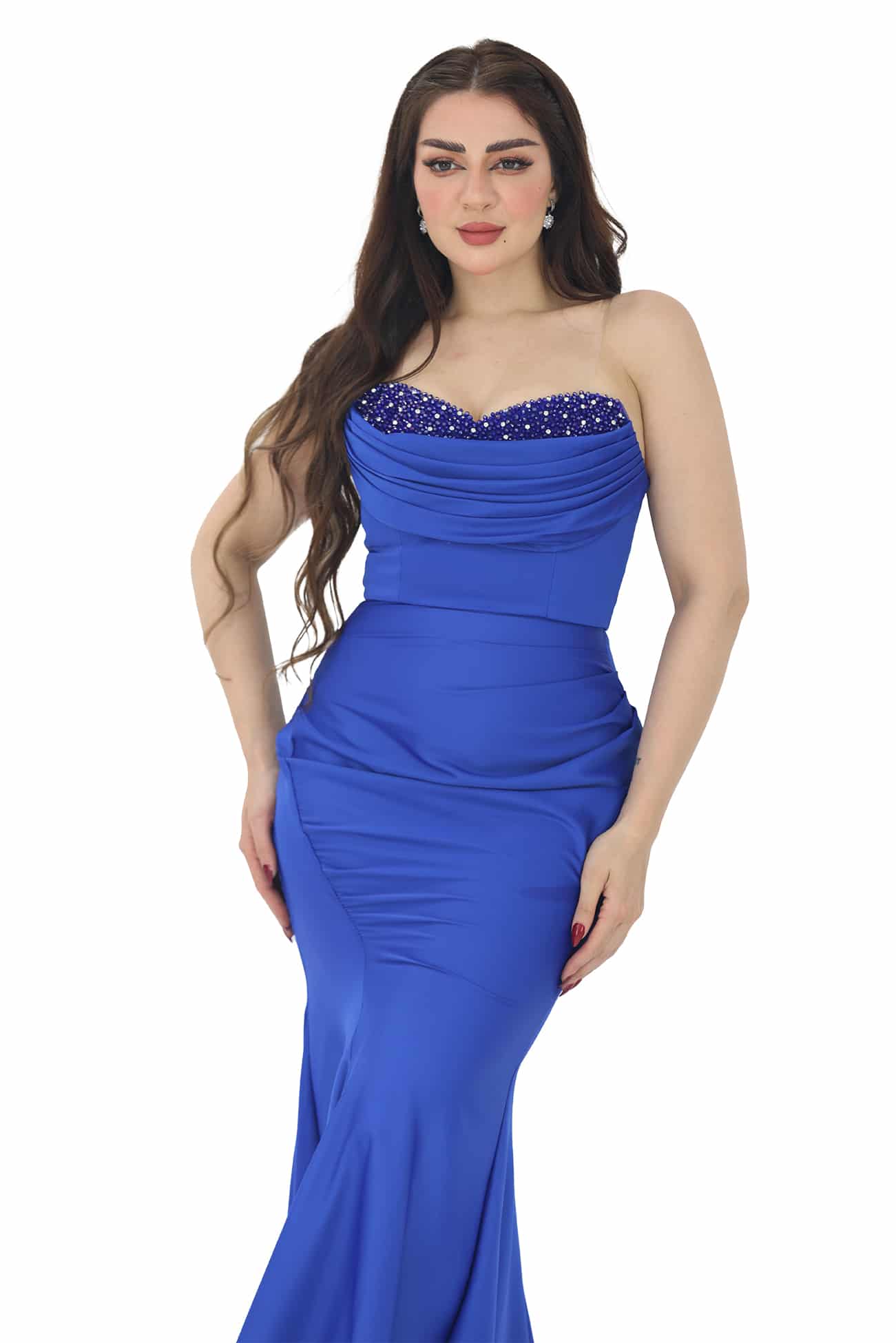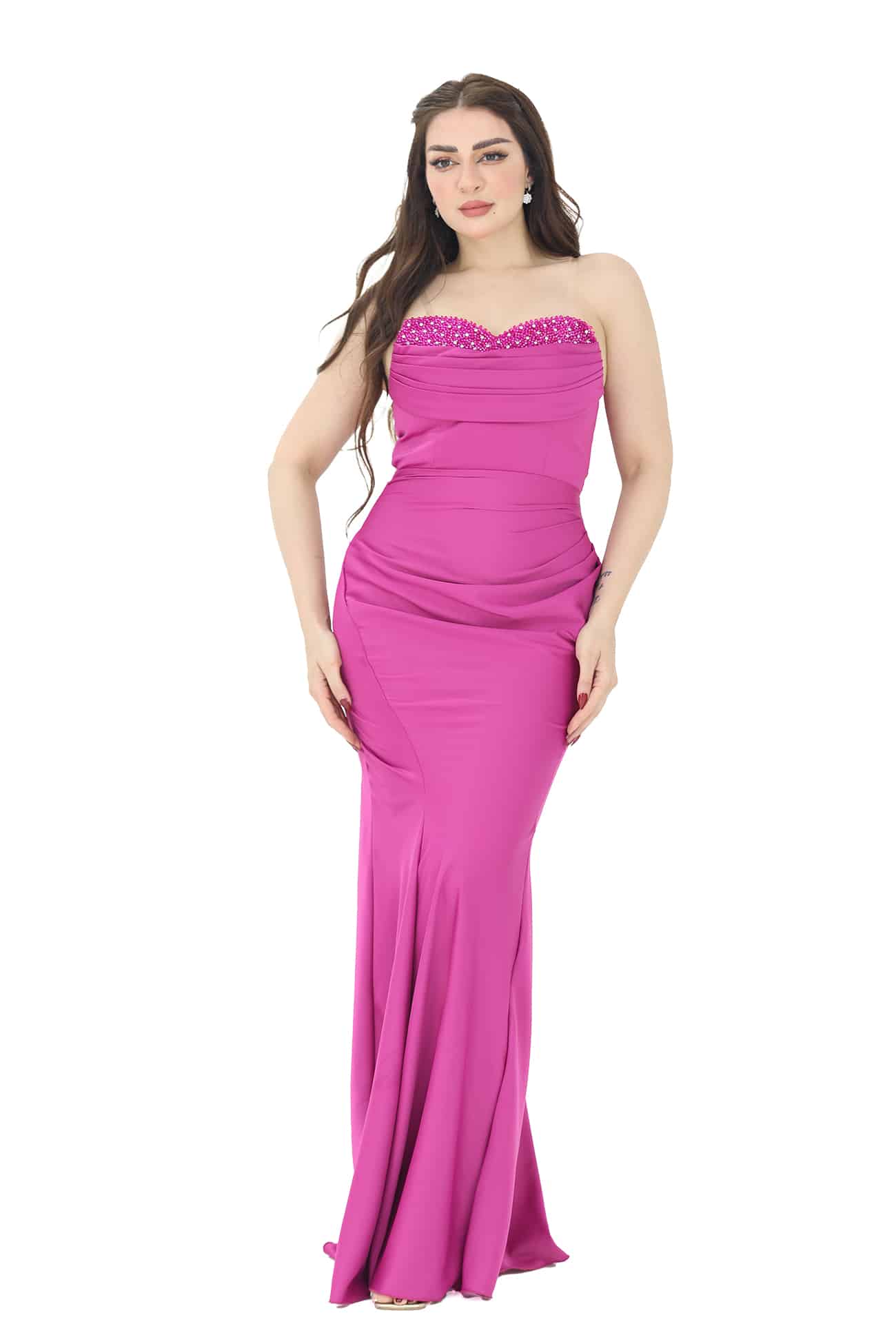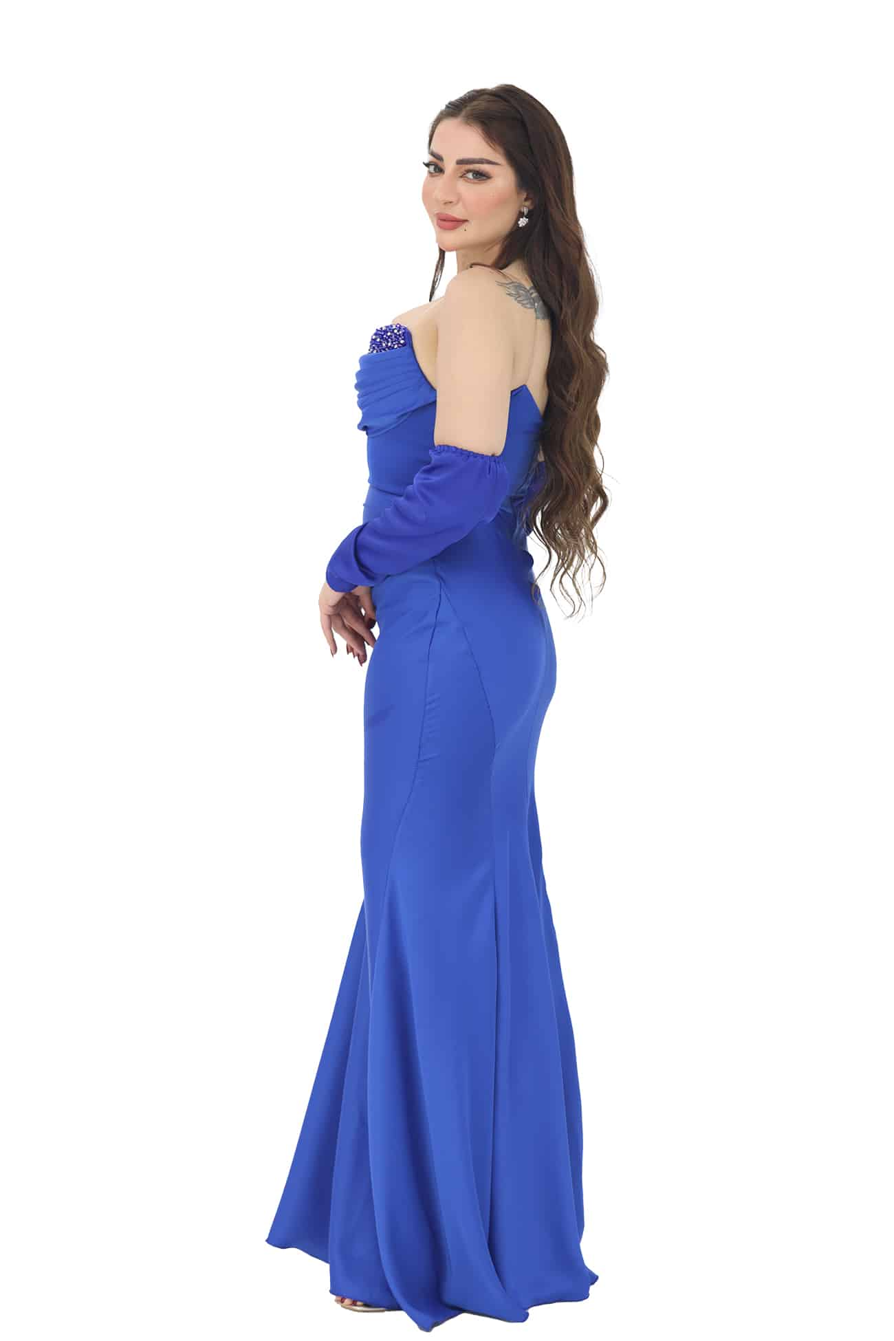 فستان ناعم بتطريز يدوي فاخر بالصدر بتصميم توب راقي بأكمام منفصلة بقصة ذيل سمكة يتوفر الفستان باللونين الفوشي والنيلي يتميز بالفخامة، الأناقة، والتفرد. إنه خيار رائع للمناسبات الخاصة والأحداث الرسمية، حيث ستتألقين بإطلالة ساحرة ومبهجة.