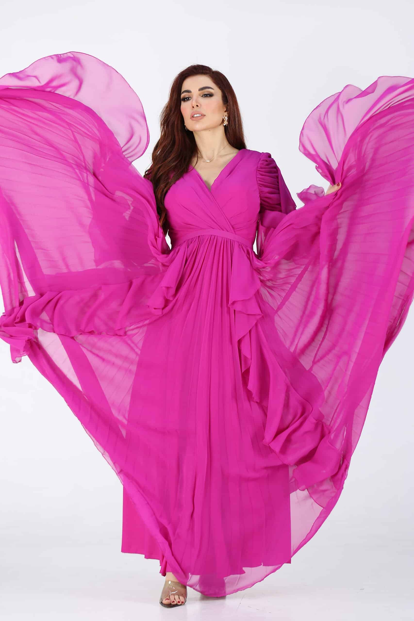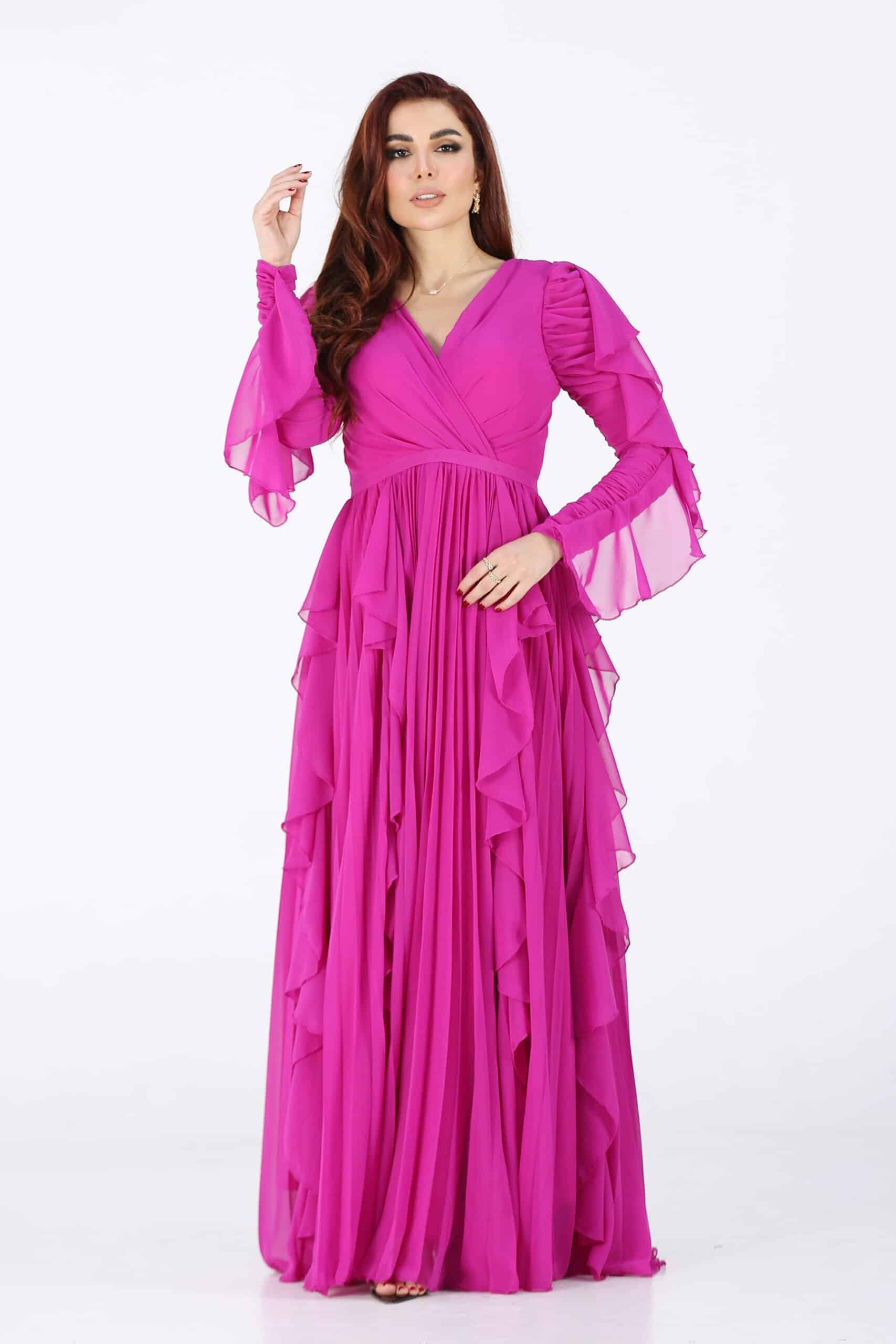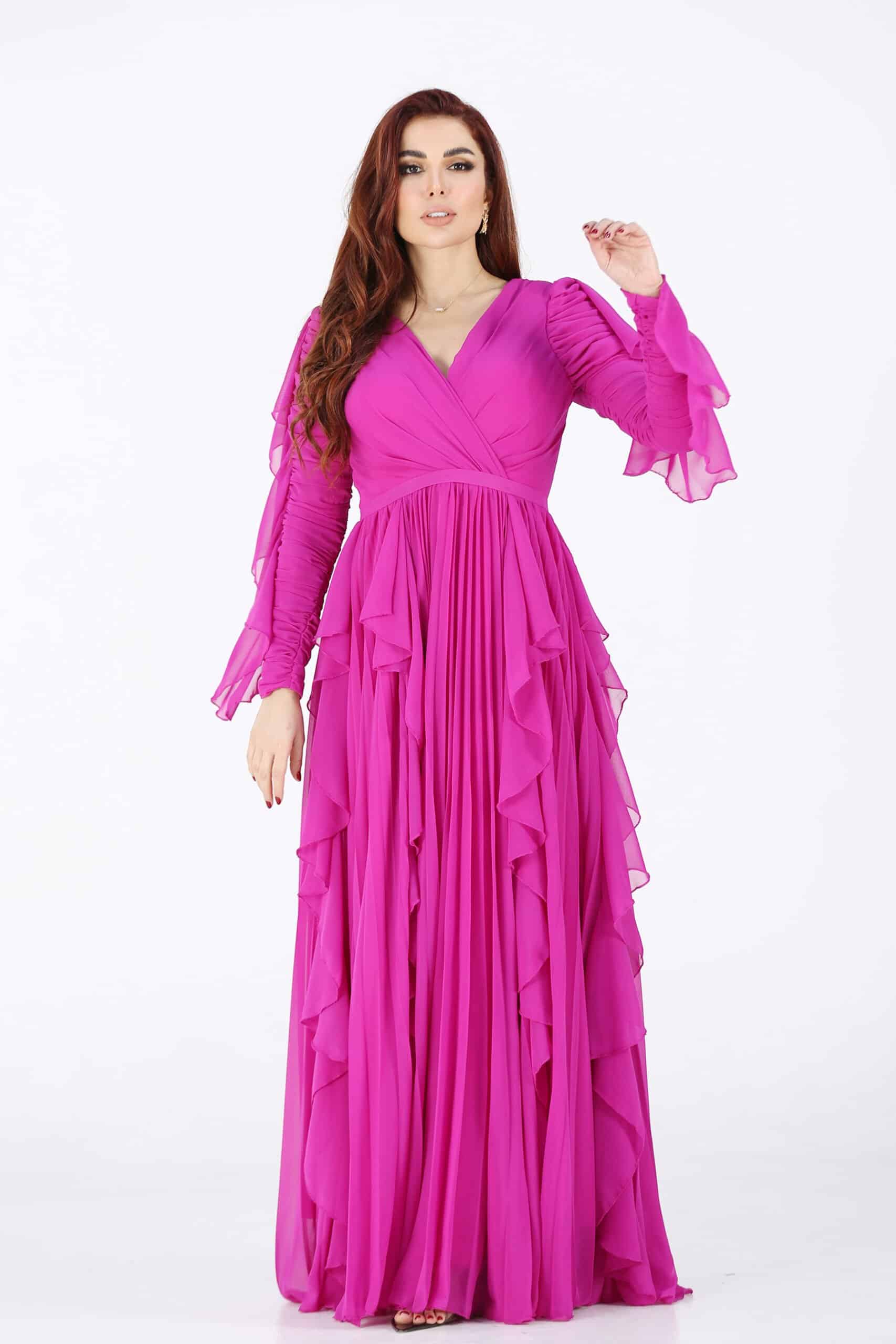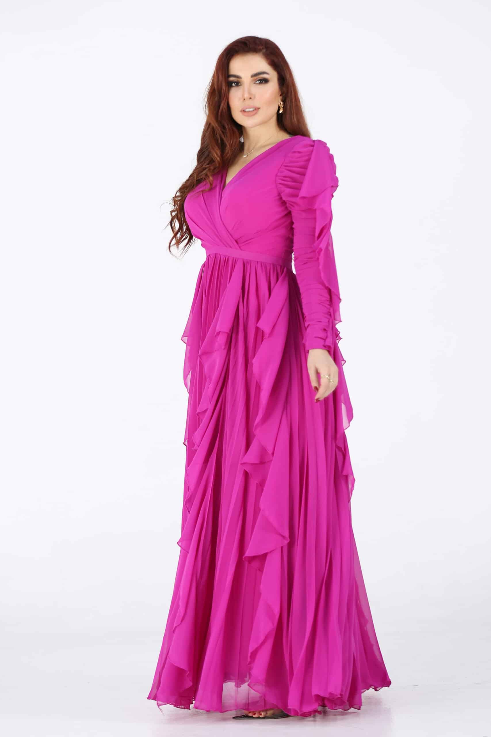 فستان ناعم بقصات متمايلة فوشي وأكمام طويلة هو خيار رائع للمناسبات الرسمية والسهرات الخاصة. إنه تصميم أنيق وجذاب يجمع بين الأناقة والرقي، وسيساعدك على لفت الأنظار والشعور بالثقة. استمتعي بارتداء هذا الفستان واستعدّي لإشعاع الجمال والأناقة في المناسبة التي ستحضرينها.يتميز الفستان بتصميم أنيق وجذاب يلفت الأنظار. يمكن أن يكون له قصة ملتصقة بالجسم أو قصة متدرجة، ويتميز بتفاصيل مثل الفتحة الخلفية أو التطريز الراقي، مما يجعله قطعة فريدة ومميزة تتناغم التنورة المتمايلة مع الجسم بشكل أنيق وتعزز الحركة والأنوثة