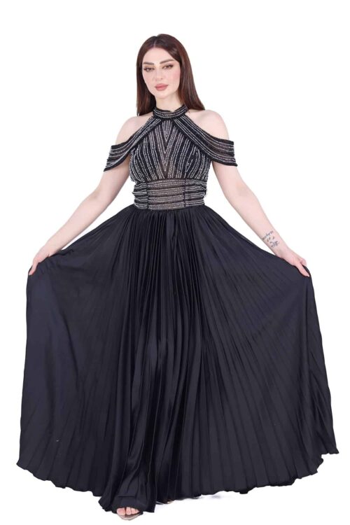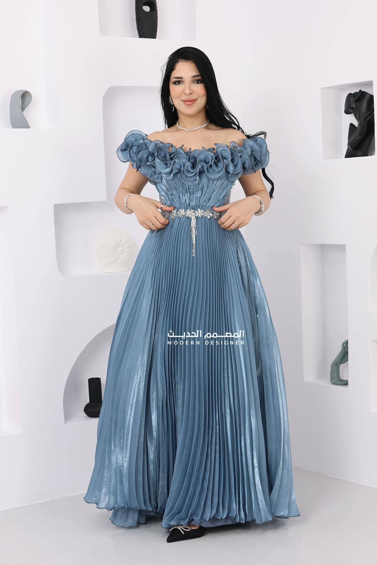 فستان ناعم فاخر طويل مصنوع من خامة الجازار اللامعة لإطلالة ساحرة. يتميز بأكمام أوف شولدر مزينة بالورد، مع تطريز أنيق على الخصر وكسرات مميزة في الأسفل تضيف لمسة من الفخامة والأنوثة. خيار مثالي للسهرات والمناسبات الراقية.