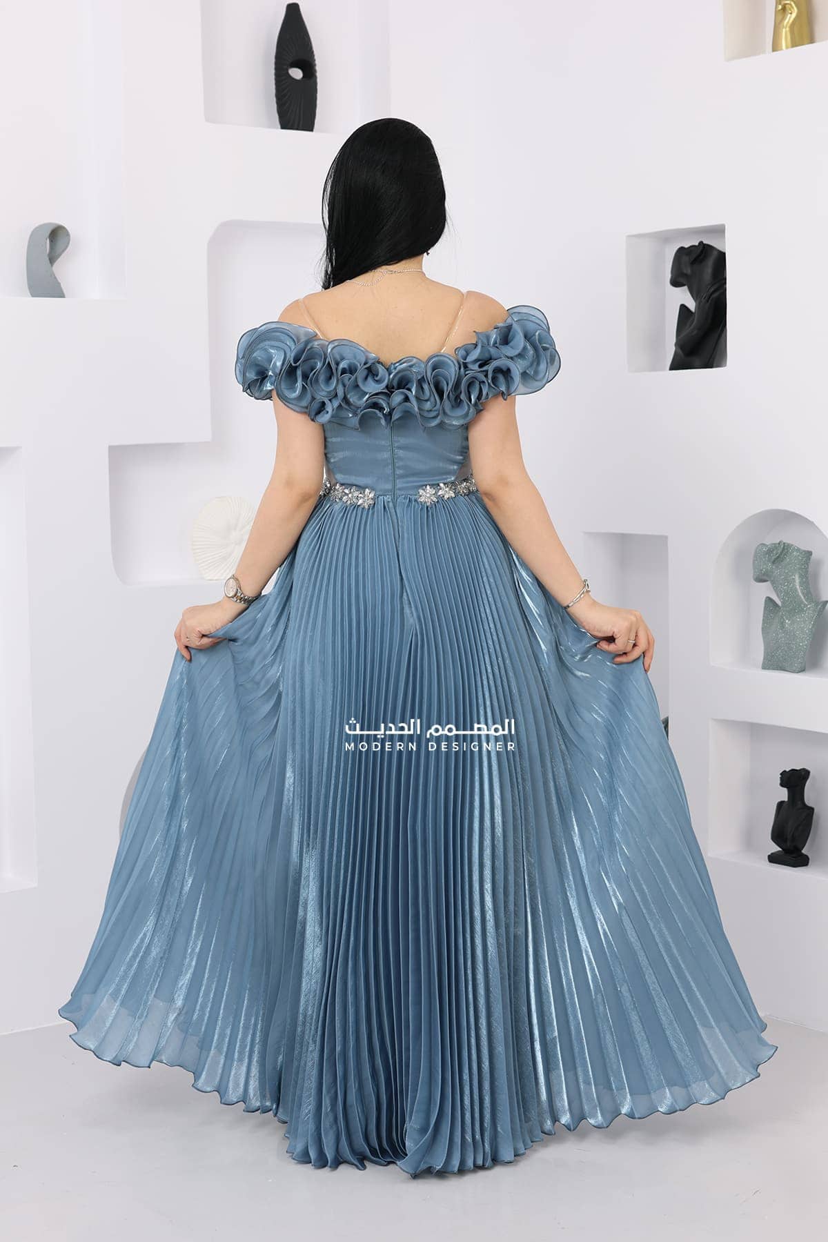 التخزين السليم: قومي بتخزين الفستان في مكان جاف ومنعزل عن الرطوبة للحفاظ على جمال الكريستالات والإكسسوارات.