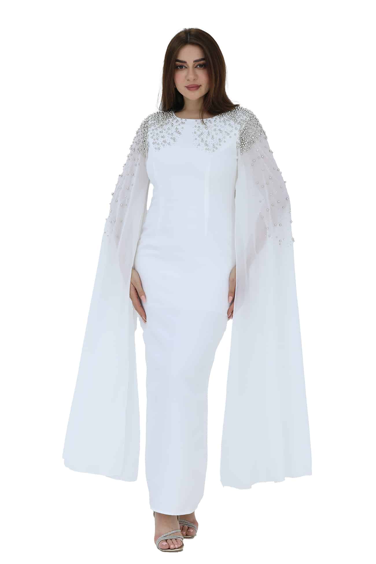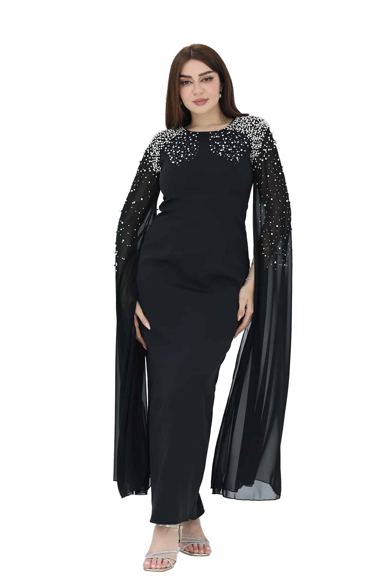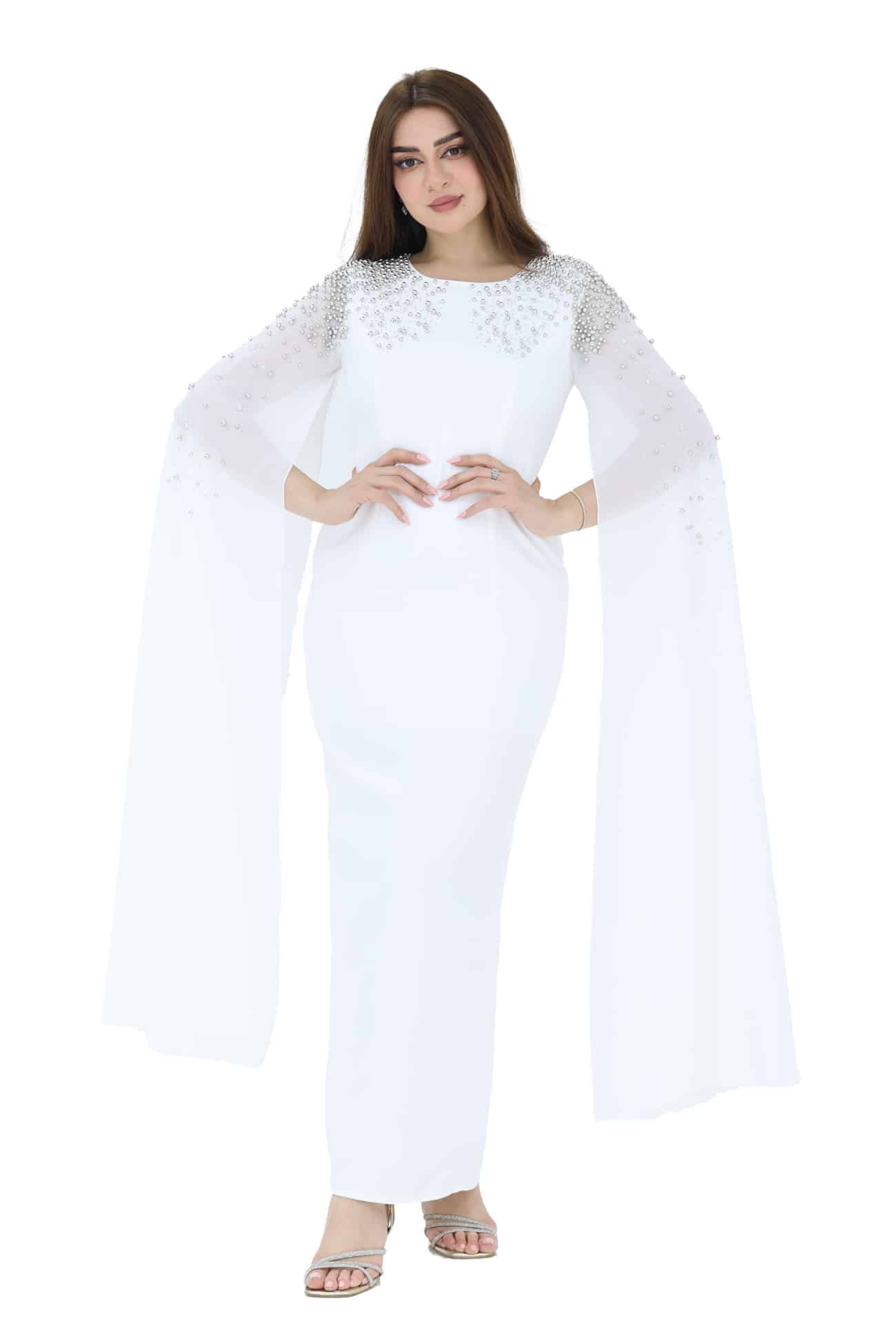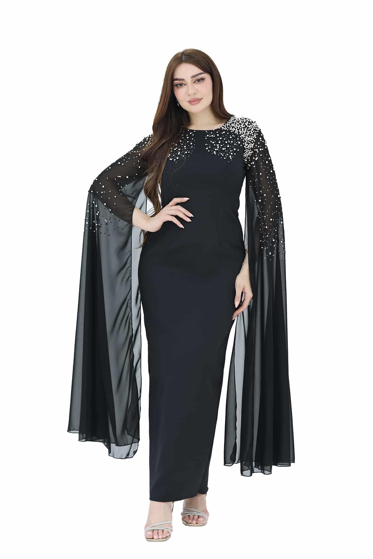 فستان ناعم فخم بتطريز راقي واكمام منديل شيفون راقيه ومن خامة الكريب وبتصميم أنيق وساحر يجمع بين الأناقة والرقي، ويضفي لمسة من الجمال والأنوثة على إطلالتك خيار مثالي لإطلالة رائعة وأنيقة. يمكن للتطريز الفخم والأكمام منديل الشيفون والتصميم الراقي أن يضفوا لمسة من الجمال والأنوثة على إطلالتك. ستشعرين بالثقة والجاذبية عند ارتداء هذا الفستان الفاخر.
