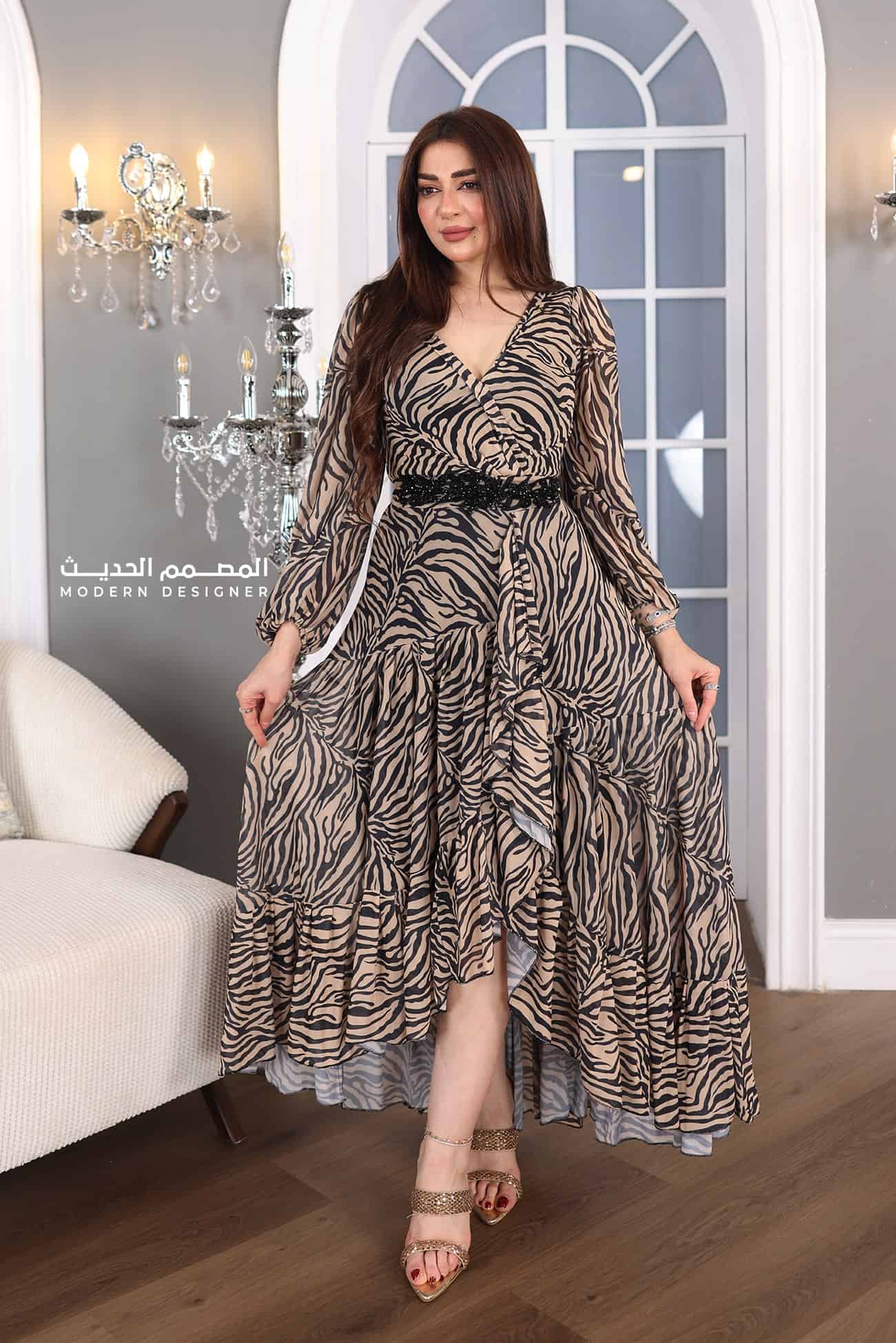 فستان نمري بتصميم فاخر بأكمام طويله بتطريز انيق طويل من الخلف قصير من الامام بتصميم حديث ليبرز جمالك واناقتك سيبرز جمالك وأناقتك بشكل استثنائي. ستتألقين بإطلالة ساحرة ومميزة، وستكونين محط الأنظار في أي مناسبة ترتدينها.