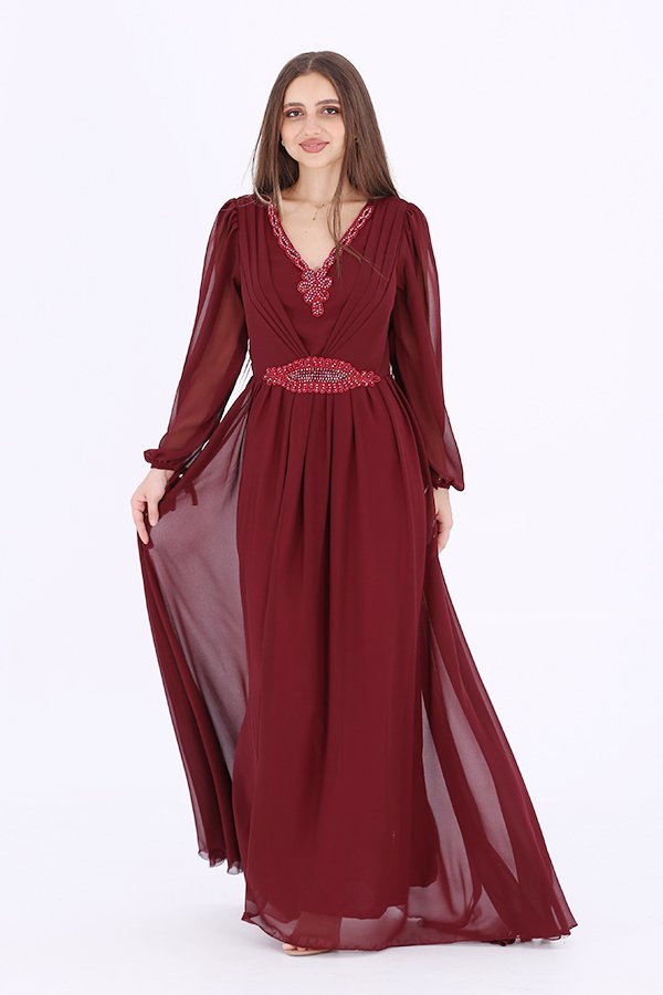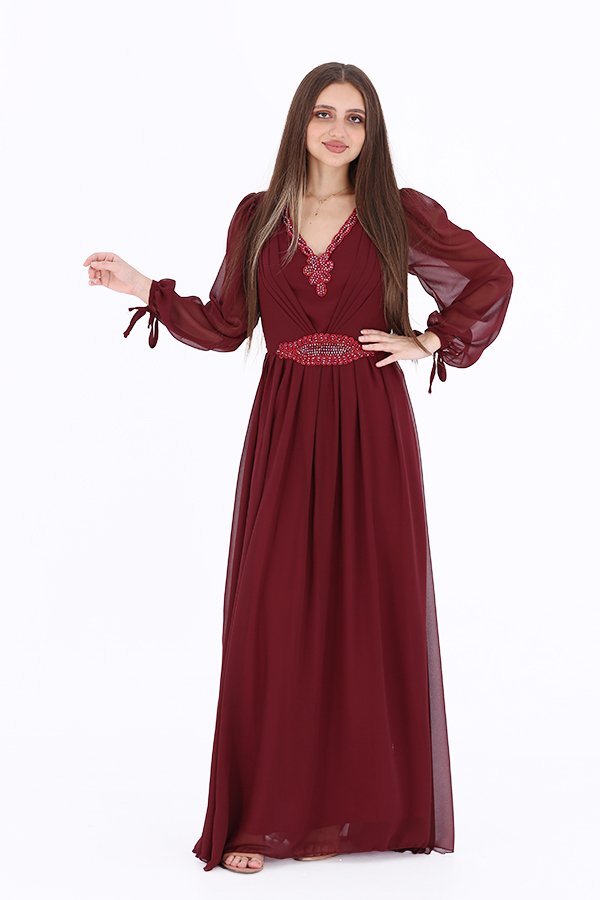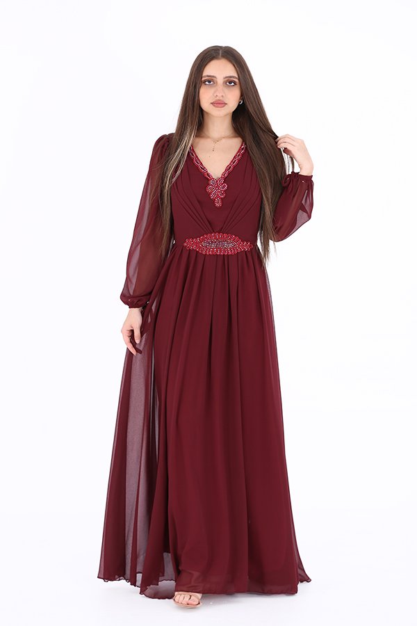 فستان سهرة طويل فخم باللون العودي هو الخيار المثالي للمناسبات الراقية. مصنوع من خامة الشيفون الناعمة التي تضفي عليه لمسة من الرقي والأنوثة، يتميز بتصميمه الأنيق الذي يجمع بين الفخامة والتفاصيل الدقيقة.